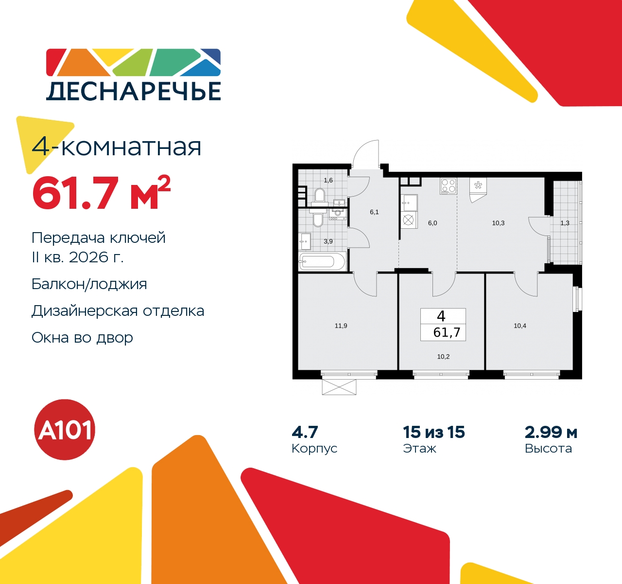 4-комн. квартира с европланировкой и отделкой в ЖК "Деснаречье" на 15 этаже. Общая площадь: 61.7 кв.м., жилая: 42.8 кв.м., общая площадь гостиной-столовой с кухонной зоной: 16.3 кв.м. Европланировка, площадь комнат позволяет разместить в них все необходимое, а в просторной кухне-гостиной удобно как готовить, так и отдыхать. Квартира угловая, идеально подойдет любителям тишины и панорамных видов. В квартире одна лоджия, один совмещенный и один раздельный санузел. Высота потолков 2.99 м. Эта квартира будет сдана с дизайнеркой отделкой "под ключ". Специально для вас мы разработали несколько решений дизайнерской отделки. В отделке используются только современный высококлассные материалы, на все работы предоставляется гарантия. В таком случае вы оплачиваете отделку в сегодняшних ценах, а эту стоимость вы можете разнести в ипотечных платежах. Дом монолитный, трехподъездный, высотой 15 этажей. Квартира находится в 3-й секции в корпусе 4.7. На этаже 6 квартир. В подъезде 1 пассажирский и 1 грузовой лифт. Начало строительства - 3 квартал 2023 года. Окончание строительства - 2 квартал 2026 года. Оформление сделки по договору долевого участия. Артикул квартиры по базе застройщика 88К-4.7-1691. ПРЕДЛОЖЕНИЯ ОТ ЗАСТРОЙЩИКА В ОКТЯБРЕ 2025: Ипотека от 13,9 % для всех! На весь срок. "Семейная ипотека" вернулась. Ставка от 3,5 % на весь срок! Без удорожания! Выгодное ипотечное комбо: Ипотека от 2200 р./мес. и от 6 % после рождения ребёнка! Ипотека для всех "Держи пять!" - ставка 5 % на 2 года! *более подробную информацию по скидкам и акциям уточняйте в отделе продаж Масштабный проект "Деснаречье" на юго-западе Москвы, который включает три новых района («квартала»), объединённые общей идеей – воплотить в реальность мечты современных жителей столицы об интересном, комфортном и разноплановом городском пространстве в окружении рек и лесов, словно сошедших с полотен русских живописцев: - «Берег» оценят все, кому близка водная стихия: плеск волн, солнечные блики и прогулки вдоль тихого течения речи. - «Лес» утопает в зелени парков и лесов. Здесь соблюдён идеальный баланс загородного спокойствия и столичного комфорта. - «Парк», самый энергичный и яркий, отличается высокой концентрацией пространств для спорта и творчества. Жилой комплекс "Деснаречье" расположится в 12 км от МКАД по современному Калужскому шоссе. Внешний облик зданий соответствует современному стилю и стандартам, характерным и для других популярных проектов ГК «А101»: сочетание контрастных тонов, большое количество остекления, в котором отражается небо, гармония с природным окружением. Весь город - в вашем районе. Находиться на территории «15-минутного города» значит иметь всё необходимое для полноценной жизни в шаговой доступности. Маршруты в районе «Деснаречье» выстроены так, чтобы добраться до магазинов, парков, школ, салонов услуг и других объектов можно было всего за несколько минут пешком или на велосипеде. Двор закрытый от машин – это тишина, комфорт и безопасность, поэтому все машино-места (включая «семейные» и увеличенные, с возможностью установки роллетных шкафов) находятся в подземном паркинге. В паркинги можно спуститься на лифте из любого подъезда или по лестнице. Рядом с «Деснаречьем» в 2027 году планируется открытие станции метро «Десна», до которой будет удобно добраться пешком или на велосипеде. Дорога на автомобиле до