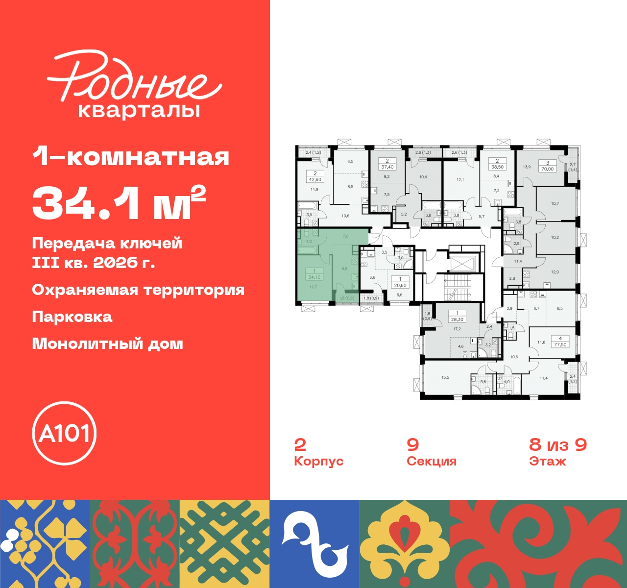 Однокомнатная квартира в ЖК "Родные кварталы" на 8 этаже. Квартира без отделки, после оформления собственности можно делать ремонт. Общая площадь: 34.1 кв.м., жилая: 12.7 кв.м., площадь кухни: 8.9 кв.м. Все окна выходят на одну сторону. В квартире одна лоджия, один совмещенный санузел. Высота потолков 2.9 м. Дом монолитный, многоподъездный, высотой 9 этажей. Квартира находится в 9-й секции в корпусе 2. На этаже 8 квартир. В подъезде 1 грузовой лифт. Начало строительства - 4 квартал 2023 года. Окончание строительства - 3 квартал 2026 года. Оформление сделки по договору долевого участия. Артикул квартиры по базе застройщика 96К-2-426. ПРЕДЛОЖЕНИЯ ОТ ЗАСТРОЙЩИКА В ОКТЯБРЕ 2025: Ипотека от 13,9 % для всех! На весь срок. "Семейная ипотека" вернулась. Ставка от 3,5 % на весь срок! Без удорожания! Выгодное ипотечное комбо: Ипотека от 2200 р./мес. и от 6 % после рождения ребёнка! Ипотека для всех "Держи пять!" - ставка 5 % на 2 года! *более подробную информацию по скидкам и акциям уточняйте в отделе продаж Новый жилой комплекс "Родные кварталы" строится в уютной, экологически благополучной локации на юго-западе столицы. В ближайшем окружении – ухоженные малоэтажные посёлки и живописный Ульяновский лесопарк. Благодаря этому из окон откроются вдохновляющие виды, которые не исчезнут со временем за фасадами многоэтажек. Через весь район пройдёт главный бульвар, который свяжет набережную, жилые кварталы и площади в единое дружелюбное пространство, органично наполненное узнаваемыми элементами культурных традиций разных народов. В жилом комплексе создаются условия для комфортного отдыха и занятий спортом всех жителей. Здесь можно прогуляться и отдохнуть в лесопарке на берегу ручья, позаниматься на тренажёрах под открытым небом и спортивных площадках. Для малышей построят игровые комплексы, развивающие силу, координацию и ловкость. Всего в жилом комплексе будет оборудовано 6 га территории для спокойного отдыха и около 9 га — для активного. Подъезды в домах освещены в любое время суток, входы и вестибюль хорошо просматриваются с улицы. Витражное остекление обеспечивает приток естественного света днём, а вечером зажигаются светильники. В отделке домов используется сочетание вентилируемого фасада с облицовкой из фибробетонной плитки и штукатуркой. Комфортная высота домов соразмерна человеку и в среднем составляет 10 этажей. Все дома обеспечены собственными подземными паркингами. В них размещаются машино-места и кладовые. В паркинг или кладовую можно спуститься на лифте или по лестнице. В комплексе появятся бытовые сервисы, магазины, аптеки и другие торгово-бытовые объекты. В жилом районе «Родные кварталы» будут построены: - образовательный центр: школа на 1300 учеников и детский сад на 250 малышей, - два детских сада на 200 мест каждый (один из них сдаётся в 1-й очереди). В транспортной доступности уже работают: - школа № 41 и детский сад — по Боровскому шоссе, - школа № 2057 и детский сад — на запад от района, в дер. Марушкино. ЖК «Родные кварталы» строится в Новомосковском округе столицы, в 15 минутах на автомобиле от аэропорта «Внуково». Район обеспечен удобными выездами на три крупные современные автотрассы. Здесь уже работает и активно развивается система наземного общественного транспорта, включая междугородние рейсы. Интенсивное развитие локации обеспечивают две действующие станции к