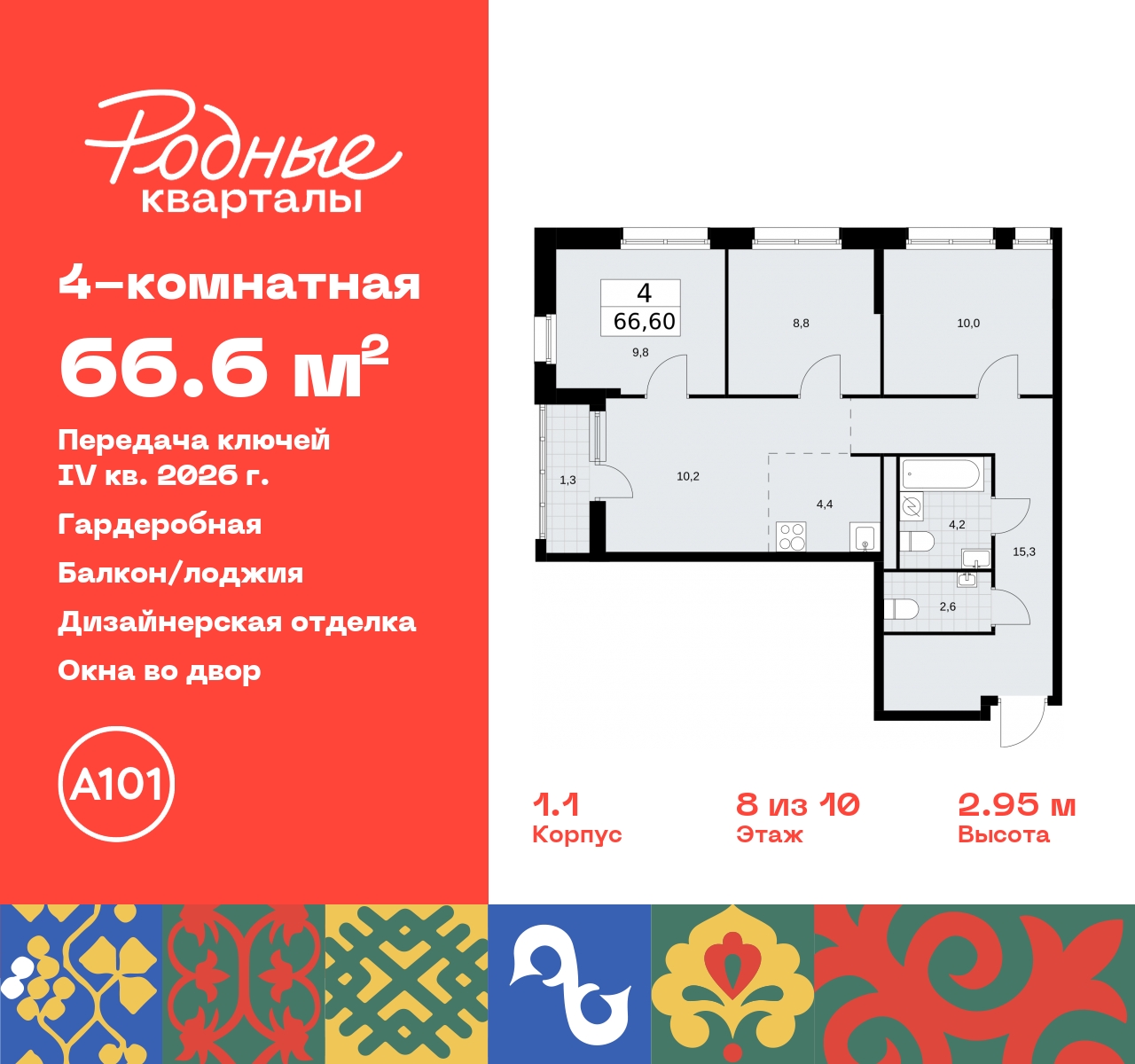 4-комн. квартира с европланировкой и отделкой в ЖК "Родные кварталы" на 8 этаже. Общая площадь: 66.6 кв.м., жилая: 38.8 кв.м., суммарная площадь гостиной-столовой с кухонной зоной: 14.6 кв.м. Европейская планировка, кухня-гостиная - идеальный вариант для тех, кто любит часто принимать гостей. Угловая квартира, идеально подойдет любителям тишины и панорамных видов. В квартире одна лоджия, один совмещенный и один раздельный санузел. Высота потолков 2.9 м. Имеется ниша под гардероб. Квартира находится в корпусе 1.1. Дом монолитный, одноподъездный, высотой 10 этажей. На этаже 11 квартир. В подъезде 1 пассажирский и 1 грузовой лифт. Начало строительства - 4 квартал 2023 года. Окончание строительства - 4 квартал 2026 года. Оформление сделки по договору долевого участия. Артикул квартиры по базе застройщика 96К-1.1-74. ПРЕДЛОЖЕНИЯ ОТ ЗАСТРОЙЩИКА В ОКТЯБРЕ 2025: Ипотека от 13,9 % для всех! На весь срок. "Семейная ипотека" вернулась. Ставка от 3,5 % на весь срок! Без удорожания! Выгодное ипотечное комбо: Ипотека от 2200 р./мес. и от 6 % после рождения ребёнка! Ипотека для всех "Держи пять!" - ставка 5 % на 2 года! *более подробную информацию по скидкам и акциям уточняйте в отделе продаж Новый жилой комплекс "Родные кварталы" строится в уютной, экологически благополучной локации на юго-западе столицы. В ближайшем окружении – ухоженные малоэтажные посёлки и живописный Ульяновский лесопарк. Благодаря этому из окон откроются вдохновляющие виды, которые не исчезнут со временем за фасадами многоэтажек. Через весь район пройдёт главный бульвар, который свяжет набережную, жилые кварталы и площади в единое дружелюбное пространство, органично наполненное узнаваемыми элементами культурных традиций разных народов. В жилом комплексе создаются условия для комфортного отдыха и занятий спортом всех жителей. Здесь можно прогуляться и отдохнуть в лесопарке на берегу ручья, позаниматься на тренажёрах под открытым небом и спортивных площадках. Для малышей построят игровые комплексы, развивающие силу, координацию и ловкость. Всего в жилом комплексе будет оборудовано 6 га территории для спокойного отдыха и около 9 га — для активного. Подъезды в домах освещены в любое время суток, входы и вестибюль хорошо просматриваются с улицы. Витражное остекление обеспечивает приток естественного света днём, а вечером зажигаются светильники. В отделке домов используется сочетание вентилируемого фасада с облицовкой из фибробетонной плитки и штукатуркой. Комфортная высота домов соразмерна человеку и в среднем составляет 10 этажей. Все дома обеспечены собственными подземными паркингами. В них размещаются машино-места и кладовые. В паркинг или кладовую можно спуститься на лифте или по лестнице. В комплексе появятся бытовые сервисы, магазины, аптеки и другие торгово-бытовые объекты. В жилом районе «Родные кварталы» будут построены: - образовательный центр: школа на 1300 учеников и детский сад на 250 малышей, - два детских сада на 200 мест каждый (один из них сдаётся в 1-й очереди). В транспортной доступности уже работают: - школа № 41 и детский сад — по Боровскому шоссе, - школа № 2057 и детский сад — на запад от района, в дер. Марушкино. ЖК «Родные кварталы» строится в Новомосковском округе столицы, в 15 минутах на автомобиле от аэропорта «Внуково». Район обеспечен удобными выездами на три крупные современные автотрассы. Здесь