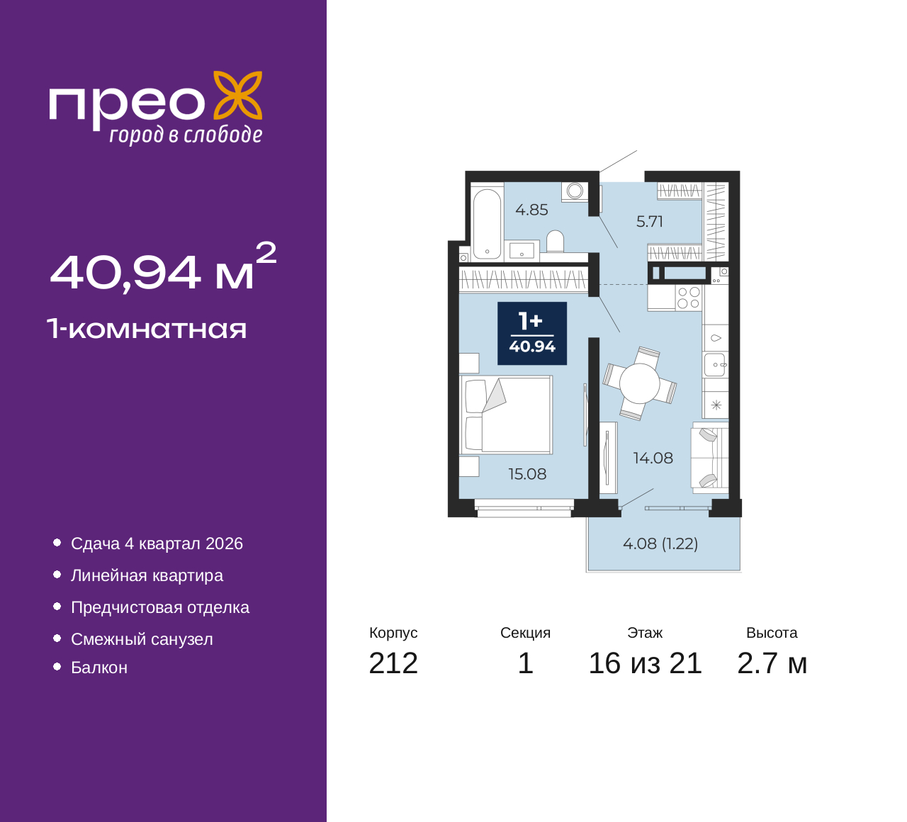 Просторная однокомнатная квартира с предчистовой отделкой в ЖК "Прео" на 16 этаже. Общая площадь: 40.94 кв.м., жилая: 15.08 кв.м., площадь просторной кухни-столовой: 14.08 кв.м. Все окна выходят на одну сторону. В квартире один балкон, один совмещенный санузел. Высота потолков 2.7 м. Квартира находится в корпусе 212. Дом монолитный, одноподъездный, высотой 21 этаж. На этаже 8 квартир. В подъезде 2 пассажирских и 1 грузовой лифт. Окончание строительства - 4 квартал 2026 года. Оформление сделки по договору долевого участия. Преображенский — один из самых привлекательных районов для жизни! Это полностью самостоятельный жилой район с точки зрения инфраструктуры. Преображенский находится между Московским и Червишевским трактами в квартале улиц Закалужская — Вьюжная — Александра Протозанова. Не нужно ждать, когда появится инфраструктура — переезжайте на всё готовое. Вблизи расположены действующие школа и детский сад. В этом году откроется еще один сад, а в следующем году — школа. По соседству с Преображенским запланировано строительство городского парка «Комарово» площадью 38 гектар. За 10 минут можно доехать на автомобиле до крупных ТРЦ: «Лента», «Кристалл», «Леруа Мерлен», «Метро» и «Ашан». С 2018 года в районе открыт Соседский центр — пространство, созданное для формирования добрососедской среды, совместного досуга, общения и реализации соседских инициатив. Здесь проходят встречи соседей, а также сами жители района организовывают мероприятия. Организатором такого события может стать любой желающий. В квартирах выполнена качественная предчистовая отделка. Гладкие стены с финишным выравниванием по маякам. Ровный потолок для установки натяжного потолка. Установлены пятикамерные окна с двойным стеклопакетом (3 стекла). Дизайнерские холлы с видеонаблюдением, безбарьерным и прозрачным входом – всегда светло и спокойно. На первом этаже есть просторные колясочные, где все жители могут оставлять свои коляски и велосипеды. В Преображенском есть всё, что нужно для активного отдыха и занятий спортом. Мы сделали большое футбольное поле с безопасным покрытием. Также установили хоккейный корт, который оборудован по всем необходимым стандартам. Во дворах можно делать упражнения на специальных площадках с турниками. Весь район мы обустроили велодорожками, которые связаны в единый маршрут. У нас есть сухие фонтаны, бьющие из земли, деревья, веревки, сетки, скалодром, газон, песок и резинка — осталось просто дать своему ребенку право на свободную игру. По-настоящему хорошие дворы — это те, которые дети предпочитают соцсетям и телевизору. Аккредитация в банках: ПАО «Банк Уралсиб», ПАО Банк «ВТБ», ПАО «Газпромбанк», ОАО «Альфа-Банк», «Сбербанк России» и других. (AQID02427519)