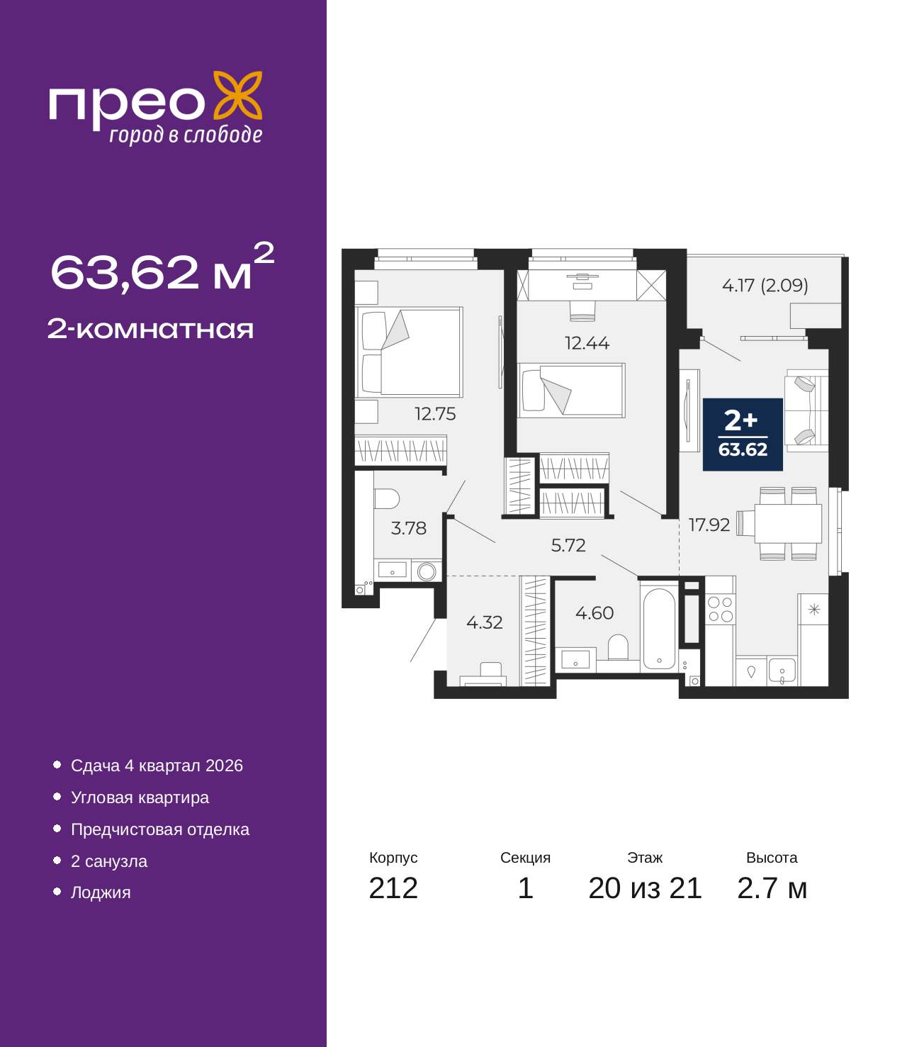 Двухкомнатная квартира с предчистовой отделкой в ЖК "Прео" на 20 этаже. Общая площадь: 63.62 кв.м., жилая: 25.19 кв.м., площадь просторной кухни-столовой: 17.92 кв.м. Угловая квартира, идеально подойдет любителям тишины и панорамных видов. В квартире одна лоджия, один совмещенный и один раздельный санузел. Высота потолков 2.7 м. Квартира находится в корпусе 212. Дом монолитный, одноподъездный, высотой 21 этаж. На этаже 8 квартир. В подъезде 2 пассажирских и 1 грузовой лифт. Окончание строительства - 4 квартал 2026 года. Оформление сделки по договору долевого участия. Преображенский — один из самых привлекательных районов для жизни! Это полностью самостоятельный жилой район с точки зрения инфраструктуры. Преображенский находится между Московским и Червишевским трактами в квартале улиц Закалужская — Вьюжная — Александра Протозанова. Не нужно ждать, когда появится инфраструктура — переезжайте на всё готовое. Вблизи расположены действующие школа и детский сад. В этом году откроется еще один сад, а в следующем году — школа. По соседству с Преображенским запланировано строительство городского парка «Комарово» площадью 38 гектар. За 10 минут можно доехать на автомобиле до крупных ТРЦ: «Лента», «Кристалл», «Леруа Мерлен», «Метро» и «Ашан». С 2018 года в районе открыт Соседский центр — пространство, созданное для формирования добрососедской среды, совместного досуга, общения и реализации соседских инициатив. Здесь проходят встречи соседей, а также сами жители района организовывают мероприятия. Организатором такого события может стать любой желающий. В квартирах выполнена качественная предчистовая отделка. Гладкие стены с финишным выравниванием по маякам. Ровный потолок для установки натяжного потолка. Установлены пятикамерные окна с двойным стеклопакетом (3 стекла). Дизайнерские холлы с видеонаблюдением, безбарьерным и прозрачным входом – всегда светло и спокойно. На первом этаже есть просторные колясочные, где все жители могут оставлять свои коляски и велосипеды. В Преображенском есть всё, что нужно для активного отдыха и занятий спортом. Мы сделали большое футбольное поле с безопасным покрытием. Также установили хоккейный корт, который оборудован по всем необходимым стандартам. Во дворах можно делать упражнения на специальных площадках с турниками. Весь район мы обустроили велодорожками, которые связаны в единый маршрут. У нас есть сухие фонтаны, бьющие из земли, деревья, веревки, сетки, скалодром, газон, песок и резинка — осталось просто дать своему ребенку право на свободную игру. По-настоящему хорошие дворы — это те, которые дети предпочитают соцсетям и телевизору. Аккредитация в банках: ПАО Банк «ВТБ», ОАО «Альфа-Банк», «Сбербанк России», ПАО «Газпромбанк», ПАО «Банк Уралсиб» и других. (AQID02427666)