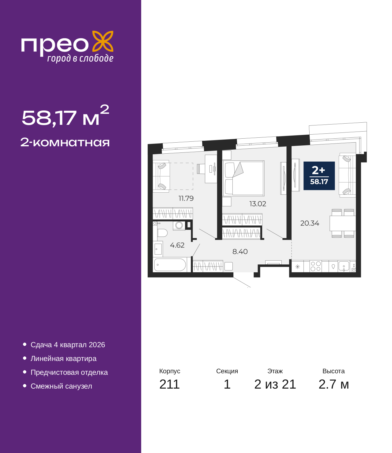- Общая площадь 58.17 м²