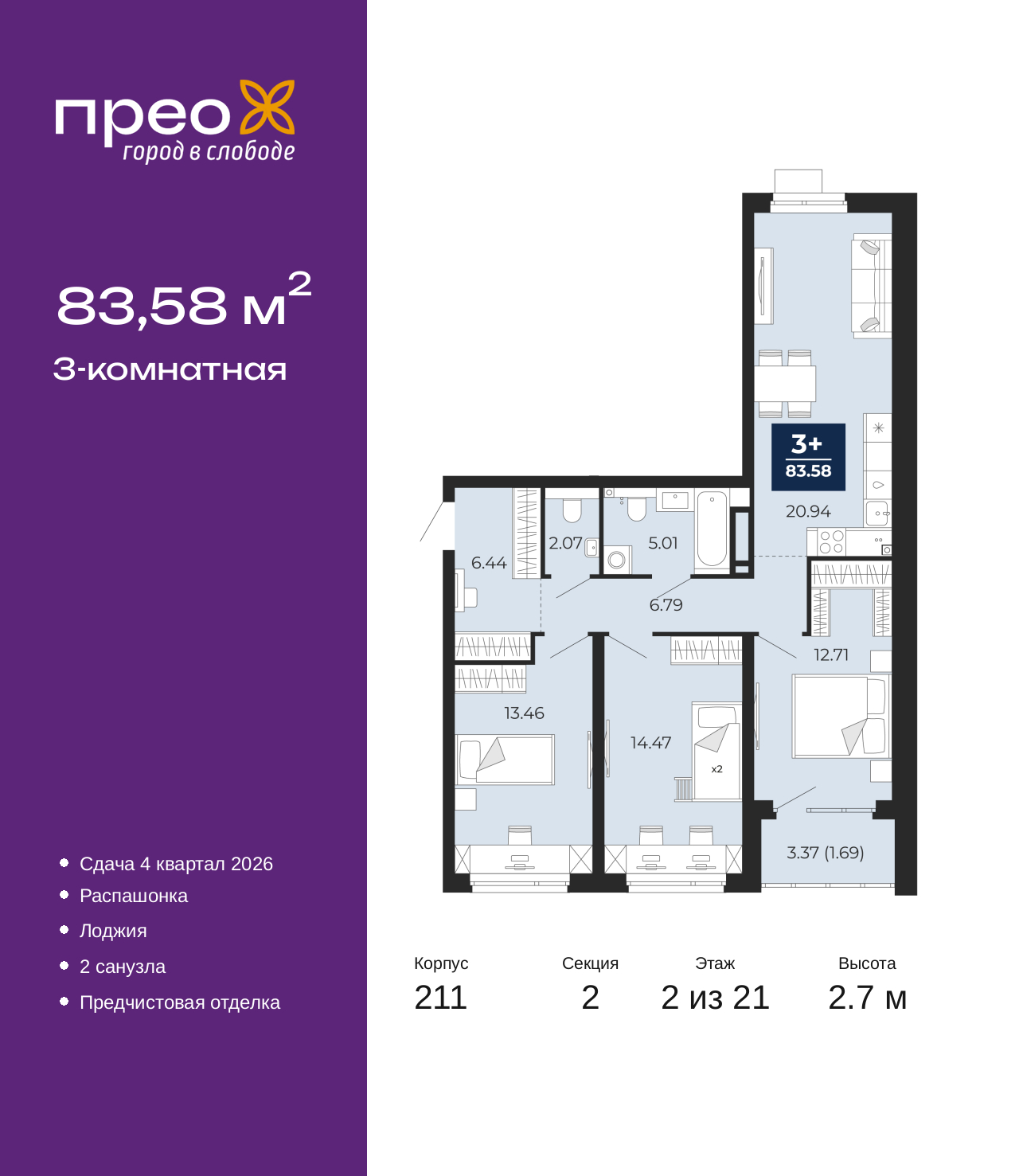 3-комн. квартира с предчистовой отделкой в ЖК "Прео" на 2 этаже. Общая площадь: 83.58 кв.м., жилая: 40.64 кв.м., площадь просторной кухни-столовой: 20.94 кв.м. Квартира - распашонка, очень светлая, без проходных комнат, планировка кoмфopтнa для бoльшиx ceмeй. В квартире одна лоджия, один совмещенный и один раздельный санузел. Высота потолков 2.7 м. Дом монолитный, черырехподъездный, переменной этажности, от 14 до 21 этажей. Квартира находится во 2-й секции высотой 21 этаж в корпусе 211. На этаже 10 квартир. В подъезде 1 пассажирский и 1 грузовой лифт. Окончание строительства - 4 квартал 2026 года. Оформление сделки по договору долевого участия. Преображенский — один из самых привлекательных районов для жизни! Это полностью самостоятельный жилой район с точки зрения инфраструктуры. Преображенский находится между Московским и Червишевским трактами в квартале улиц Закалужская — Вьюжная — Александра Протозанова. Не нужно ждать, когда появится инфраструктура — переезжайте на всё готовое. Вблизи расположены действующие школа и детский сад. В этом году откроется еще один сад, а в следующем году — школа. По соседству с Преображенским запланировано строительство городского парка «Комарово» площадью 38 гектар. За 10 минут можно доехать на автомобиле до крупных ТРЦ: «Лента», «Кристалл», «Леруа Мерлен», «Метро» и «Ашан». С 2018 года в районе открыт Соседский центр — пространство, созданное для формирования добрососедской среды, совместного досуга, общения и реализации соседских инициатив. Здесь проходят встречи соседей, а также сами жители района организовывают мероприятия. Организатором такого события может стать любой желающий. В квартирах выполнена качественная предчистовая отделка. Гладкие стены с финишным выравниванием по маякам. Ровный потолок для установки натяжного потолка. Установлены пятикамерные окна с двойным стеклопакетом (3 стекла). Дизайнерские холлы с видеонаблюдением, безбарьерным и прозрачным входом – всегда светло и спокойно. На первом этаже есть просторные колясочные, где все жители могут оставлять свои коляски и велосипеды. В Преображенском есть всё, что нужно для активного отдыха и занятий спортом. Мы сделали большое футбольное поле с безопасным покрытием. Также установили хоккейный корт, который оборудован по всем необходимым стандартам. Во дворах можно делать упражнения на специальных площадках с турниками. Весь район мы обустроили велодорожками, которые связаны в единый маршрут. У нас есть сухие фонтаны, бьющие из земли, деревья, веревки, сетки, скалодром, газон, песок и резинка — осталось просто дать своему ребенку право на свободную игру. По-настоящему хорошие дворы — это те, которые дети предпочитают соцсетям и телевизору. Аккредитация в банках: ПАО Банк «ВТБ», ПАО «Газпромбанк», «Сбербанк России», ОАО «Альфа-Банк», ПАО «Банк Уралсиб» и других. (AQID02427722)