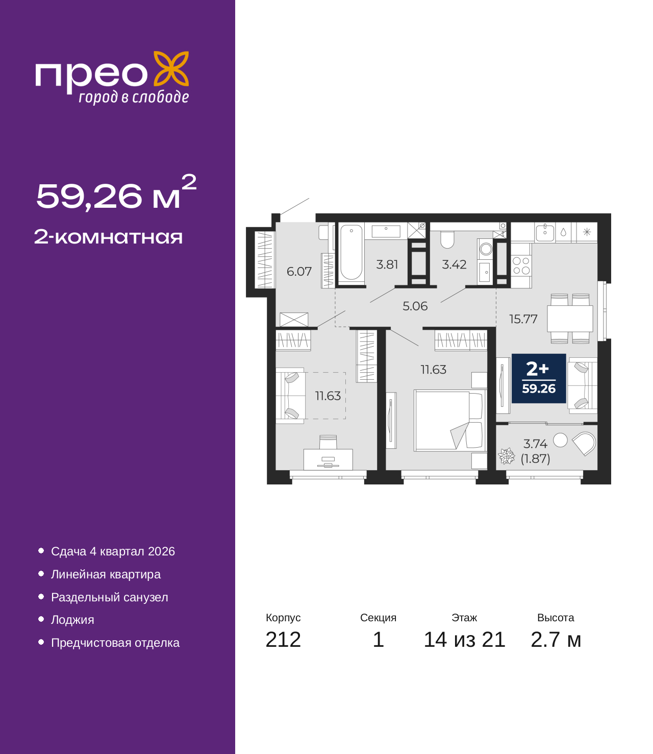 2-комн. квартира с предчистовой отделкой в ЖК "Прео" на 14 этаже. Общая площадь: 59.26 кв.м., жилая: 23.26 кв.м., площадь просторной кухни-столовой: 15.77 кв.м. Комнаты изолированные, все окна выходят на одну сторону. В квартире одна лоджия, один раздельный санузел. Высота потолков 2.7 м. Квартира находится в корпусе 212. Дом монолитный, одноподъездный, высотой 21 этаж. На этаже 8 квартир. В подъезде 2 пассажирских и 1 грузовой лифт. Окончание строительства - 4 квартал 2026 года. Оформление сделки по договору долевого участия. Преображенский — один из самых привлекательных районов для жизни! Это полностью самостоятельный жилой район с точки зрения инфраструктуры. Преображенский находится между Московским и Червишевским трактами в квартале улиц Закалужская — Вьюжная — Александра Протозанова. Не нужно ждать, когда появится инфраструктура — переезжайте на всё готовое. Вблизи расположены действующие школа и детский сад. В этом году откроется еще один сад, а в следующем году — школа. По соседству с Преображенским запланировано строительство городского парка «Комарово» площадью 38 гектар. За 10 минут можно доехать на автомобиле до крупных ТРЦ: «Лента», «Кристалл», «Леруа Мерлен», «Метро» и «Ашан». С 2018 года в районе открыт Соседский центр — пространство, созданное для формирования добрососедской среды, совместного досуга, общения и реализации соседских инициатив. Здесь проходят встречи соседей, а также сами жители района организовывают мероприятия. Организатором такого события может стать любой желающий. В квартирах выполнена качественная предчистовая отделка. Гладкие стены с финишным выравниванием по маякам. Ровный потолок для установки натяжного потолка. Установлены пятикамерные окна с двойным стеклопакетом (3 стекла). Дизайнерские холлы с видеонаблюдением, безбарьерным и прозрачным входом – всегда светло и спокойно. На первом этаже есть просторные колясочные, где все жители могут оставлять свои коляски и велосипеды. В Преображенском есть всё, что нужно для активного отдыха и занятий спортом. Мы сделали большое футбольное поле с безопасным покрытием. Также установили хоккейный корт, который оборудован по всем необходимым стандартам. Во дворах можно делать упражнения на специальных площадках с турниками. Весь район мы обустроили велодорожками, которые связаны в единый маршрут. У нас есть сухие фонтаны, бьющие из земли, деревья, веревки, сетки, скалодром, газон, песок и резинка — осталось просто дать своему ребенку право на свободную игру. По-настоящему хорошие дворы — это те, которые дети предпочитают соцсетям и телевизору. Аккредитация в банках: ПАО Банк «ВТБ», ПАО «Банк Уралсиб», ОАО «Альфа-Банк», ПАО «Газпромбанк», «Сбербанк России» и других. (AQID02427632)