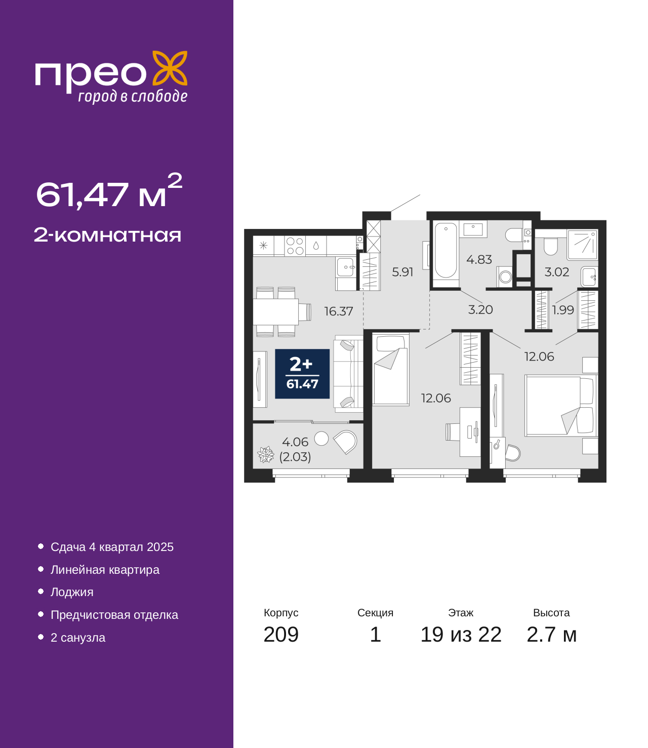 Продается 2-комн. квартира с предчистовой отделкой в ЖК "Прео" на 19 этаже. Общая площадь: 61.47 кв.м., жилая: 24.12 кв.м., площадь просторной кухни-столовой: 16.37 кв.м. Комнаты изолированные, все окна выходят на одну сторону. В квартире одна лоджия, два совмещенных санузла. Высота потолков 2.7 м. Квартира находится в корпусе 209. Дом монолитный, одноподъездный, высотой 22 этажа. На этаже 8 квартир. В подъезде 1 пассажирский и 1 грузовой лифт. Окончание строительства - 1 квартал 2026 года. Оформление сделки по договору долевого участия. Преображенский — один из самых привлекательных районов для жизни! Это полностью самостоятельный жилой район с точки зрения инфраструктуры. Преображенский находится между Московским и Червишевским трактами в квартале улиц Закалужская — Вьюжная — Александра Протозанова. Не нужно ждать, когда появится инфраструктура — переезжайте на всё готовое. Вблизи расположены действующие школа и детский сад. В этом году откроется еще один сад, а в следующем году — школа. По соседству с Преображенским запланировано строительство городского парка «Комарово» площадью 38 гектар. За 10 минут можно доехать на автомобиле до крупных ТРЦ: «Лента», «Кристалл», «Леруа Мерлен», «Метро» и «Ашан». С 2018 года в районе открыт Соседский центр — пространство, созданное для формирования добрососедской среды, совместного досуга, общения и реализации соседских инициатив. Здесь проходят встречи соседей, а также сами жители района организовывают мероприятия. Организатором такого события может стать любой желающий. В квартирах выполнена качественная предчистовая отделка. Гладкие стены с финишным выравниванием по маякам. Ровный потолок для установки натяжного потолка. Установлены пятикамерные окна с двойным стеклопакетом (3 стекла). Дизайнерские холлы с видеонаблюдением, безбарьерным и прозрачным входом – всегда светло и спокойно. На первом этаже есть просторные колясочные, где все жители могут оставлять свои коляски и велосипеды. В Преображенском есть всё, что нужно для активного отдыха и занятий спортом. Мы сделали большое футбольное поле с безопасным покрытием. Также установили хоккейный корт, который оборудован по всем необходимым стандартам. Во дворах можно делать упражнения на специальных площадках с турниками. Весь район мы обустроили велодорожками, которые связаны в единый маршрут. У нас есть сухие фонтаны, бьющие из земли, деревья, веревки, сетки, скалодром, газон, песок и резинка — осталось просто дать своему ребенку право на свободную игру. По-настоящему хорошие дворы — это те, которые дети предпочитают соцсетям и телевизору. Аккредитация в банках: ОАО «Альфа-Банк», «Сбербанк России», ПАО «Банк Уралсиб», ПАО «Газпромбанк», ПАО Банк «ВТБ» и других. (AQID02355835)