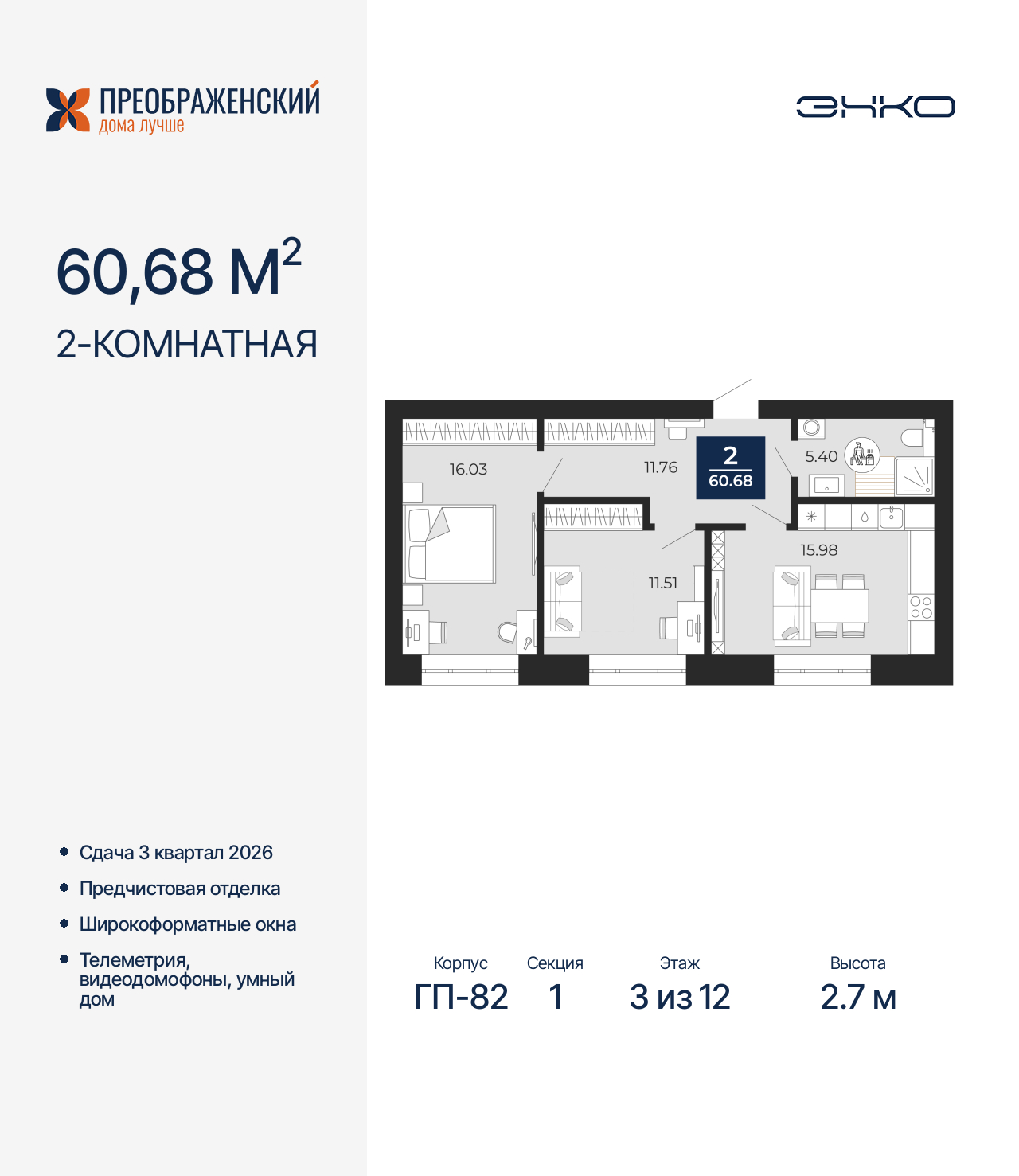 Двухкомнатная квартира с предчистовой отделкой в ЖК "Преображенский" на 3 этаже. Общая площадь: 60.68 кв.м., жилая: 27.54 кв.м., площадь просторной кухни-столовой: 15.98 кв.м. Комнаты изолированные, все окна выходят на одну сторону. В квартире один совмещенный санузел. Высота потолков 2.7 м. Дом монолитный, многоподъездный, переменной этажности, от 8 до 12 этажей. Квартира находится в 1-й секции высотой 12 этажей в корпусе ГП-82. На этаже 7 квартир. В подъезде 1 пассажирский и 1 грузовой лифт. Окончание строительства - 3 квартал 2026 года. Оформление сделки по договору долевого участия. Квартал будет расположен в микрорайоне Славянский на пересечении улиц Мира и 70-летия Октября. Престижный район, собственный парк, вся необходимая для жизни, учёбы и работы инфраструктура — новая школа с бассейном и кванториумом, новый детский сад, поликлиника, спорткомплекс, магазины и др. Чтобы в квартирах было как можно больше свободного пространства, мы предусмотрели индивидуальные кладовые на цокольном этаже. Оставляйте коляски и сезонный спортинвентарь после прогулок здесь — удобно для вас и чисто для квартиры. В подземный паркинг можно спуститься на лифте прямо с квартирной площадки. (AQID02421369)