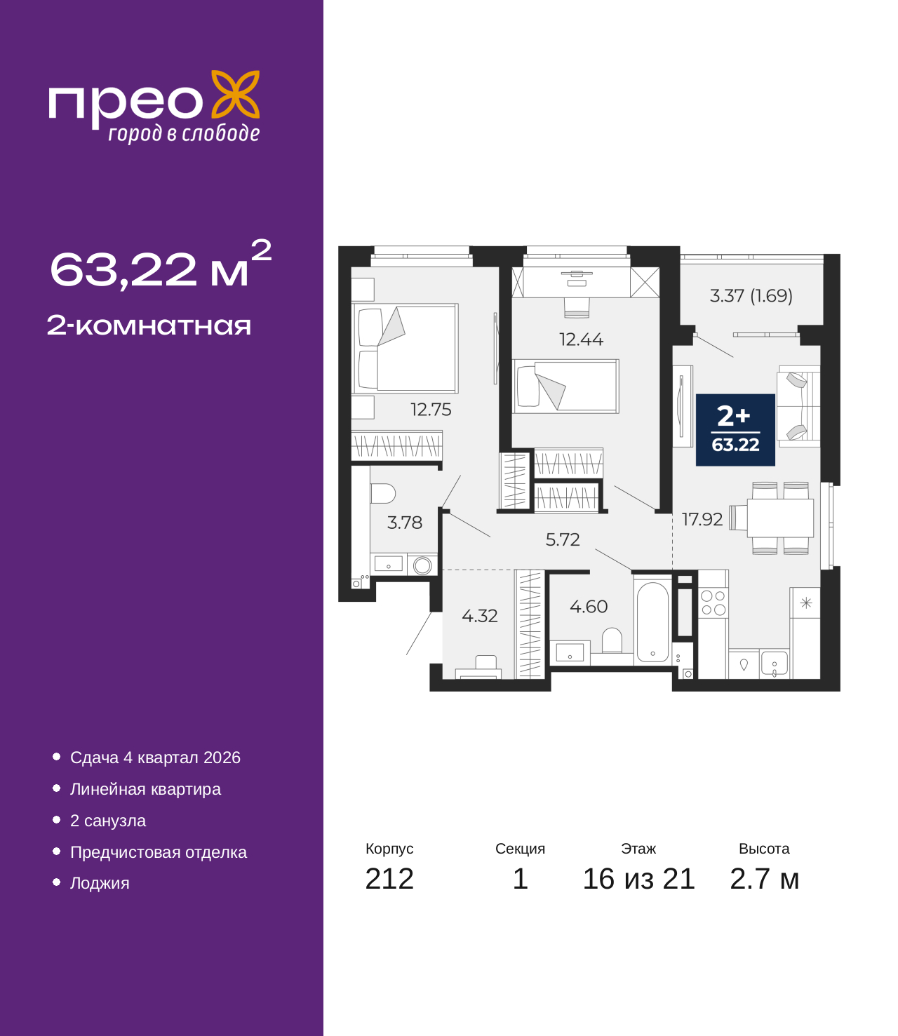 Просторная 2-комн. квартира с предчистовой отделкой в ЖК "Прео" на 16 этаже. Общая площадь: 63.22 кв.м., жилая: 25.19 кв.м., площадь просторной кухни-столовой: 17.92 кв.м. Комнаты изолированные, все окна выходят на одну сторону. В квартире одна лоджия, один совмещенный и один раздельный санузел. Высота потолков 2.7 м. Квартира находится в корпусе 212. Дом монолитный, одноподъездный, высотой 21 этаж. На этаже 8 квартир. В подъезде 2 пассажирских и 1 грузовой лифт. Окончание строительства - 4 квартал 2026 года. Оформление сделки по договору долевого участия. Преображенский — один из самых привлекательных районов для жизни! Это полностью самостоятельный жилой район с точки зрения инфраструктуры. Преображенский находится между Московским и Червишевским трактами в квартале улиц Закалужская — Вьюжная — Александра Протозанова. Не нужно ждать, когда появится инфраструктура — переезжайте на всё готовое. Вблизи расположены действующие школа и детский сад. В этом году откроется еще один сад, а в следующем году — школа. По соседству с Преображенским запланировано строительство городского парка «Комарово» площадью 38 гектар. За 10 минут можно доехать на автомобиле до крупных ТРЦ: «Лента», «Кристалл», «Леруа Мерлен», «Метро» и «Ашан». С 2018 года в районе открыт Соседский центр — пространство, созданное для формирования добрососедской среды, совместного досуга, общения и реализации соседских инициатив. Здесь проходят встречи соседей, а также сами жители района организовывают мероприятия. Организатором такого события может стать любой желающий. В квартирах выполнена качественная предчистовая отделка. Гладкие стены с финишным выравниванием по маякам. Ровный потолок для установки натяжного потолка. Установлены пятикамерные окна с двойным стеклопакетом (3 стекла). Дизайнерские холлы с видеонаблюдением, безбарьерным и прозрачным входом – всегда светло и спокойно. На первом этаже есть просторные колясочные, где все жители могут оставлять свои коляски и велосипеды. В Преображенском есть всё, что нужно для активного отдыха и занятий спортом. Мы сделали большое футбольное поле с безопасным покрытием. Также установили хоккейный корт, который оборудован по всем необходимым стандартам. Во дворах можно делать упражнения на специальных площадках с турниками. Весь район мы обустроили велодорожками, которые связаны в единый маршрут. У нас есть сухие фонтаны, бьющие из земли, деревья, веревки, сетки, скалодром, газон, песок и резинка — осталось просто дать своему ребенку право на свободную игру. По-настоящему хорошие дворы — это те, которые дети предпочитают соцсетям и телевизору. Аккредитация в банках: ПАО Банк «ВТБ», ПАО «Банк Уралсиб», ОАО «Альфа-Банк», ПАО «Газпромбанк», «Сбербанк России» и других. (AQID02427669)