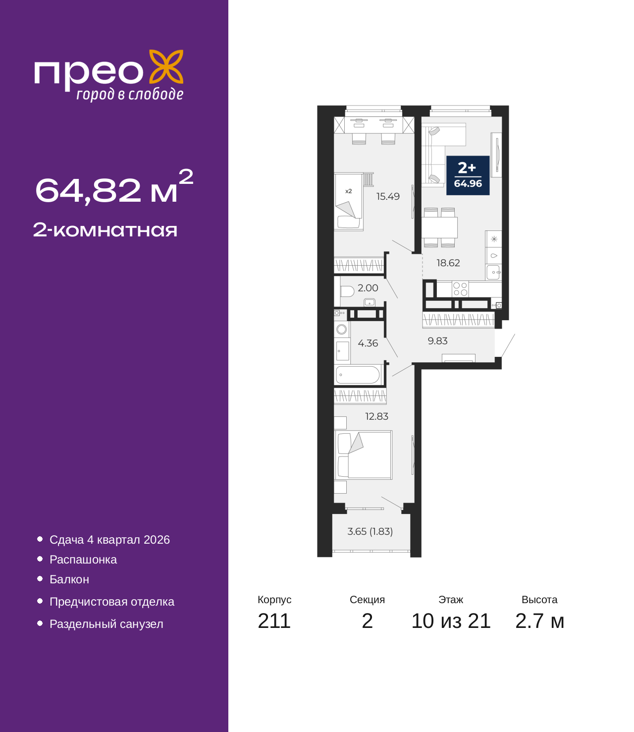 - Общая площадь 64.82 м²