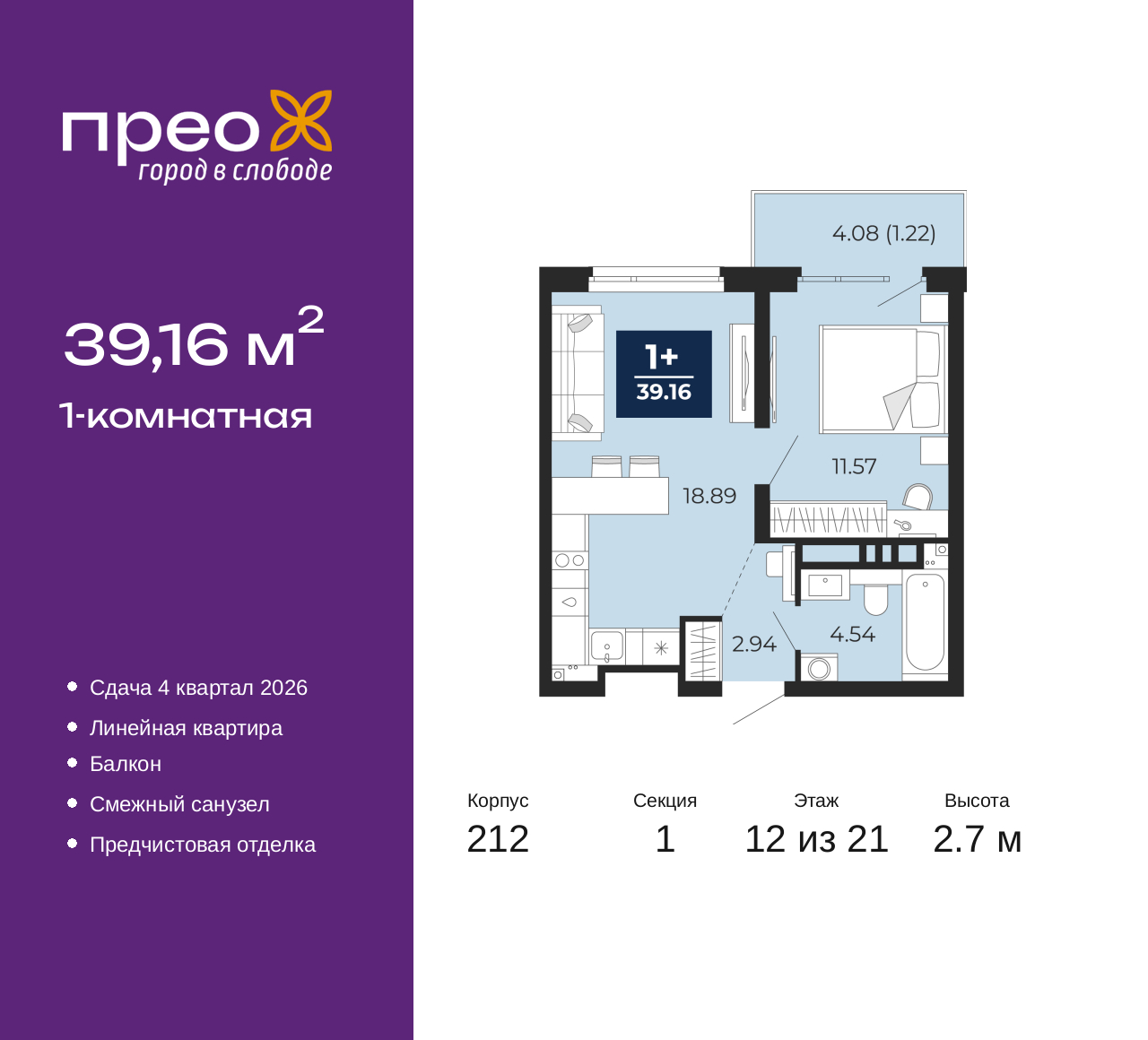 Однокомнатная квартира от застройщика с предчистовой отделкой в ЖК "Прео" на 12 этаже. Общая площадь: 39.16 кв.м., жилая: 11.57 кв.м., площадь просторной кухни-столовой: 18.9 кв.м. Все окна выходят на одну сторону. В квартире один балкон, один совмещенный санузел. Высота потолков 2.7 м. Квартира находится в корпусе 212. Дом монолитный, одноподъездный, высотой 21 этаж. На этаже 8 квартир. В подъезде 2 пассажирских и 1 грузовой лифт. Окончание строительства - 4 квартал 2026 года. Оформление сделки по договору долевого участия. Преображенский — один из самых привлекательных районов для жизни! Это полностью самостоятельный жилой район с точки зрения инфраструктуры. Преображенский находится между Московским и Червишевским трактами в квартале улиц Закалужская — Вьюжная — Александра Протозанова. Не нужно ждать, когда появится инфраструктура — переезжайте на всё готовое. Вблизи расположены действующие школа и детский сад. В этом году откроется еще один сад, а в следующем году — школа. По соседству с Преображенским запланировано строительство городского парка «Комарово» площадью 38 гектар. За 10 минут можно доехать на автомобиле до крупных ТРЦ: «Лента», «Кристалл», «Леруа Мерлен», «Метро» и «Ашан». С 2018 года в районе открыт Соседский центр — пространство, созданное для формирования добрососедской среды, совместного досуга, общения и реализации соседских инициатив. Здесь проходят встречи соседей, а также сами жители района организовывают мероприятия. Организатором такого события может стать любой желающий. В квартирах выполнена качественная предчистовая отделка. Гладкие стены с финишным выравниванием по маякам. Ровный потолок для установки натяжного потолка. Установлены пятикамерные окна с двойным стеклопакетом (3 стекла). Дизайнерские холлы с видеонаблюдением, безбарьерным и прозрачным входом – всегда светло и спокойно. На первом этаже есть просторные колясочные, где все жители могут оставлять свои коляски и велосипеды. В Преображенском есть всё, что нужно для активного отдыха и занятий спортом. Мы сделали большое футбольное поле с безопасным покрытием. Также установили хоккейный корт, который оборудован по всем необходимым стандартам. Во дворах можно делать упражнения на специальных площадках с турниками. Весь район мы обустроили велодорожками, которые связаны в единый маршрут. У нас есть сухие фонтаны, бьющие из земли, деревья, веревки, сетки, скалодром, газон, песок и резинка — осталось просто дать своему ребенку право на свободную игру. По-настоящему хорошие дворы — это те, которые дети предпочитают соцсетям и телевизору. Аккредитация в банках: ПАО Банк «ВТБ», ПАО «Банк Уралсиб», «Сбербанк России», ОАО «Альфа-Банк», ПАО «Газпромбанк» и других. (AQID02427495)