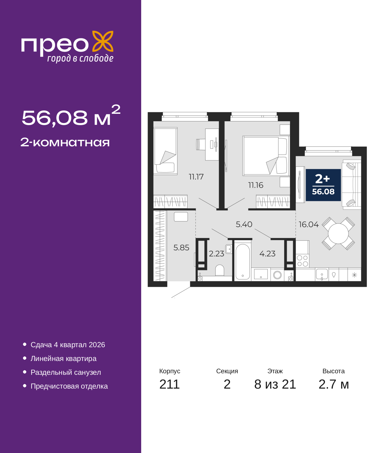 Продается двухкомнатная квартира с предчистовой отделкой в ЖК "Прео" на 8 этаже. Общая площадь: 56.08 кв.м., жилая: 22.33 кв.м., площадь просторной кухни-столовой: 16.04 кв.м. Комнаты изолированные, все окна выходят на одну сторону. В квартире один раздельный санузел. Высота потолков 2.7 м. Дом монолитный, черырехподъездный, переменной этажности, от 14 до 21 этажей. Квартира находится во 2-й секции высотой 21 этаж в корпусе 211. На этаже 10 квартир. В подъезде 1 пассажирский и 1 грузовой лифт. Окончание строительства - 4 квартал 2026 года. Оформление сделки по договору долевого участия. Преображенский — один из самых привлекательных районов для жизни! Это полностью самостоятельный жилой район с точки зрения инфраструктуры. Преображенский находится между Московским и Червишевским трактами в квартале улиц Закалужская — Вьюжная — Александра Протозанова. Не нужно ждать, когда появится инфраструктура — переезжайте на всё готовое. Вблизи расположены действующие школа и детский сад. В этом году откроется еще один сад, а в следующем году — школа. По соседству с Преображенским запланировано строительство городского парка «Комарово» площадью 38 гектар. За 10 минут можно доехать на автомобиле до крупных ТРЦ: «Лента», «Кристалл», «Леруа Мерлен», «Метро» и «Ашан». С 2018 года в районе открыт Соседский центр — пространство, созданное для формирования добрососедской среды, совместного досуга, общения и реализации соседских инициатив. Здесь проходят встречи соседей, а также сами жители района организовывают мероприятия. Организатором такого события может стать любой желающий. В квартирах выполнена качественная предчистовая отделка. Гладкие стены с финишным выравниванием по маякам. Ровный потолок для установки натяжного потолка. Установлены пятикамерные окна с двойным стеклопакетом (3 стекла). Дизайнерские холлы с видеонаблюдением, безбарьерным и прозрачным входом – всегда светло и спокойно. На первом этаже есть просторные колясочные, где все жители могут оставлять свои коляски и велосипеды. В Преображенском есть всё, что нужно для активного отдыха и занятий спортом. Мы сделали большое футбольное поле с безопасным покрытием. Также установили хоккейный корт, который оборудован по всем необходимым стандартам. Во дворах можно делать упражнения на специальных площадках с турниками. Весь район мы обустроили велодорожками, которые связаны в единый маршрут. У нас есть сухие фонтаны, бьющие из земли, деревья, веревки, сетки, скалодром, газон, песок и резинка — осталось просто дать своему ребенку право на свободную игру. По-настоящему хорошие дворы — это те, которые дети предпочитают соцсетям и телевизору. Аккредитация в банках: ОАО «Альфа-Банк», ПАО «Банк Уралсиб», ПАО «Газпромбанк», ПАО Банк «ВТБ», «Сбербанк России» и других. (AQID02427607)