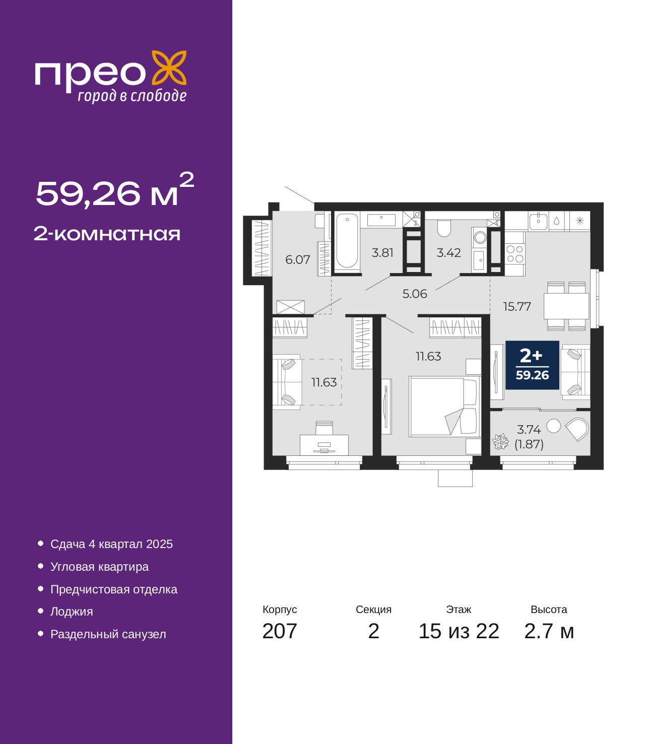 Просторная 2-комн. квартира с предчистовой отделкой в ЖК "Прео" на 15 этаже. Общая площадь: 59.26 кв.м., жилая: 23.26 кв.м., площадь просторной кухни-столовой: 15.77 кв.м. Угловая квартира, окна oбecпeчивaют paвнoмepнoe ocвeщeниe в тeчeниe дня. В квартире одна лоджия, один раздельный санузел. Высота потолков 2.7 м. Дом монолитный, двухподъездный, высотой 22 этажа. Квартира находится во 2-й секции в корпусе 207. На этаже 8 квартир. В подъезде 1 пассажирский и 1 грузовой лифт. Окончание строительства - 1 квартал 2026 года. Оформление сделки по договору долевого участия. Преображенский — один из самых привлекательных районов для жизни! Это полностью самостоятельный жилой район с точки зрения инфраструктуры. Преображенский находится между Московским и Червишевским трактами в квартале улиц Закалужская — Вьюжная — Александра Протозанова. Не нужно ждать, когда появится инфраструктура — переезжайте на всё готовое. Вблизи расположены действующие школа и детский сад. В этом году откроется еще один сад, а в следующем году — школа. По соседству с Преображенским запланировано строительство городского парка «Комарово» площадью 38 гектар. За 10 минут можно доехать на автомобиле до крупных ТРЦ: «Лента», «Кристалл», «Леруа Мерлен», «Метро» и «Ашан». С 2018 года в районе открыт Соседский центр — пространство, созданное для формирования добрососедской среды, совместного досуга, общения и реализации соседских инициатив. Здесь проходят встречи соседей, а также сами жители района организовывают мероприятия. Организатором такого события может стать любой желающий. В квартирах выполнена качественная предчистовая отделка. Гладкие стены с финишным выравниванием по маякам. Ровный потолок для установки натяжного потолка. Установлены пятикамерные окна с двойным стеклопакетом (3 стекла). Дизайнерские холлы с видеонаблюдением, безбарьерным и прозрачным входом – всегда светло и спокойно. На первом этаже есть просторные колясочные, где все жители могут оставлять свои коляски и велосипеды. В Преображенском есть всё, что нужно для активного отдыха и занятий спортом. Мы сделали большое футбольное поле с безопасным покрытием. Также установили хоккейный корт, который оборудован по всем необходимым стандартам. Во дворах можно делать упражнения на специальных площадках с турниками. Весь район мы обустроили велодорожками, которые связаны в единый маршрут. У нас есть сухие фонтаны, бьющие из земли, деревья, веревки, сетки, скалодром, газон, песок и резинка — осталось просто дать своему ребенку право на свободную игру. По-настоящему хорошие дворы — это те, которые дети предпочитают соцсетям и телевизору. Аккредитация в банках: «Сбербанк России», ПАО «Газпромбанк», ОАО «Альфа-Банк», ПАО «Банк Уралсиб», ПАО Банк «ВТБ» и других. (AQID02355711)