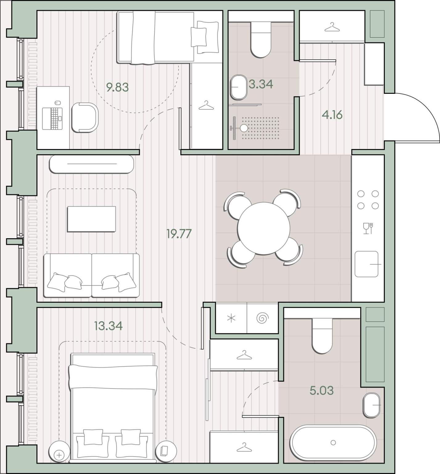 - Площадь кухни 19.77 м²