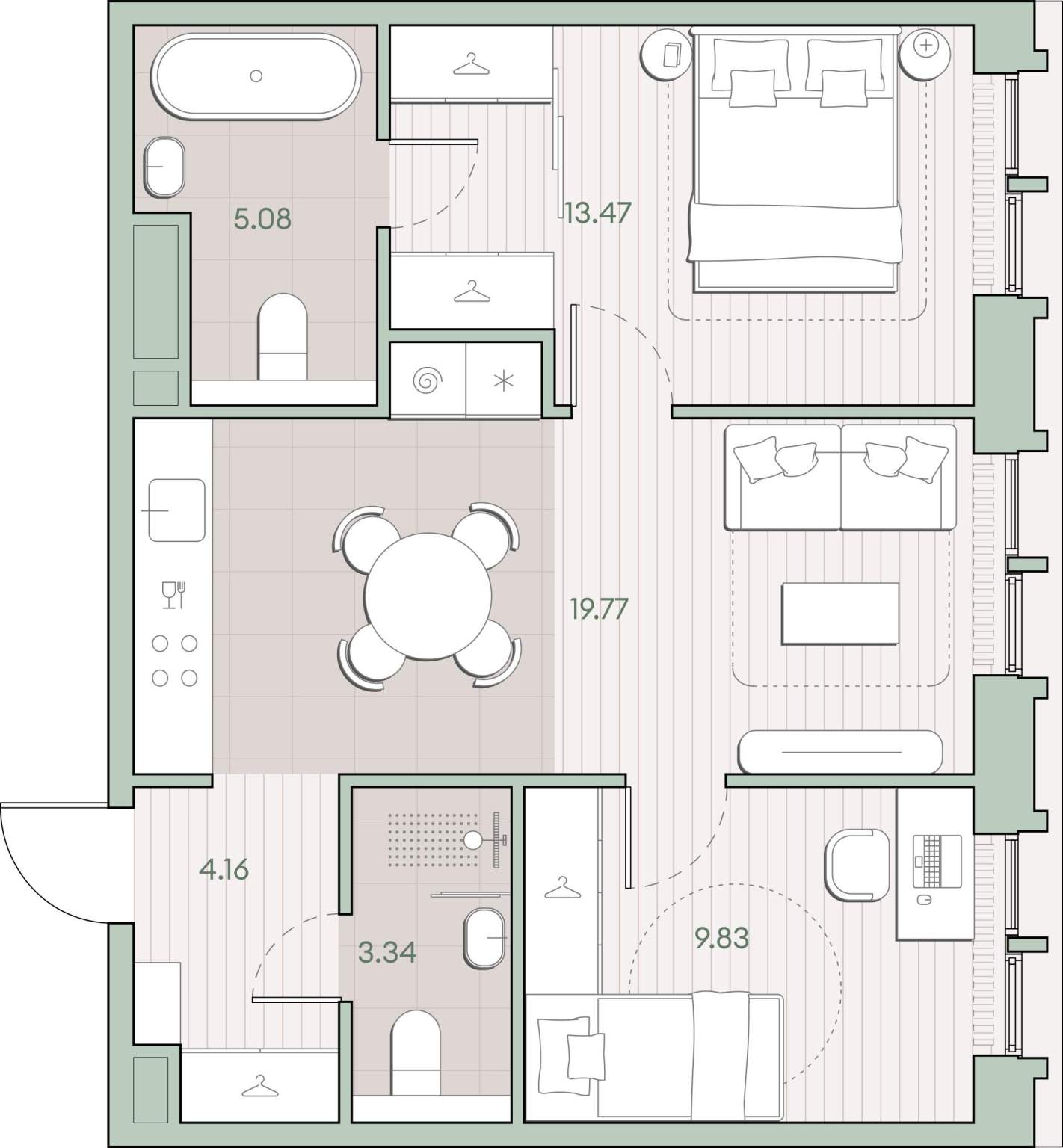 - Площадь кухни 19.77 м²