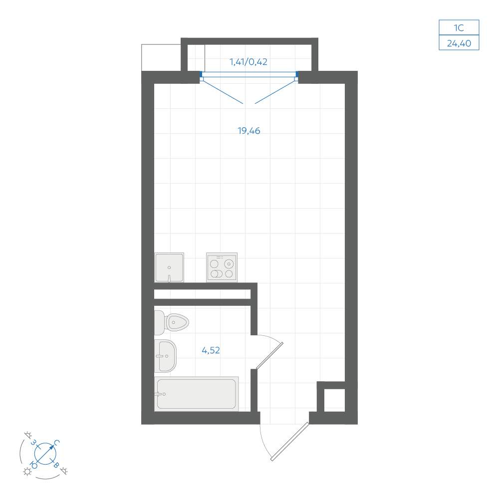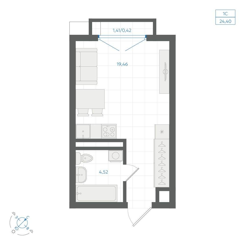 - Общая площадь 24.4 м²