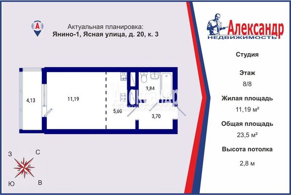 Площадь квартиры составляет 23,5 кв.м. + балкон 4.13 кв.м. Высота потолков 2,8 м.