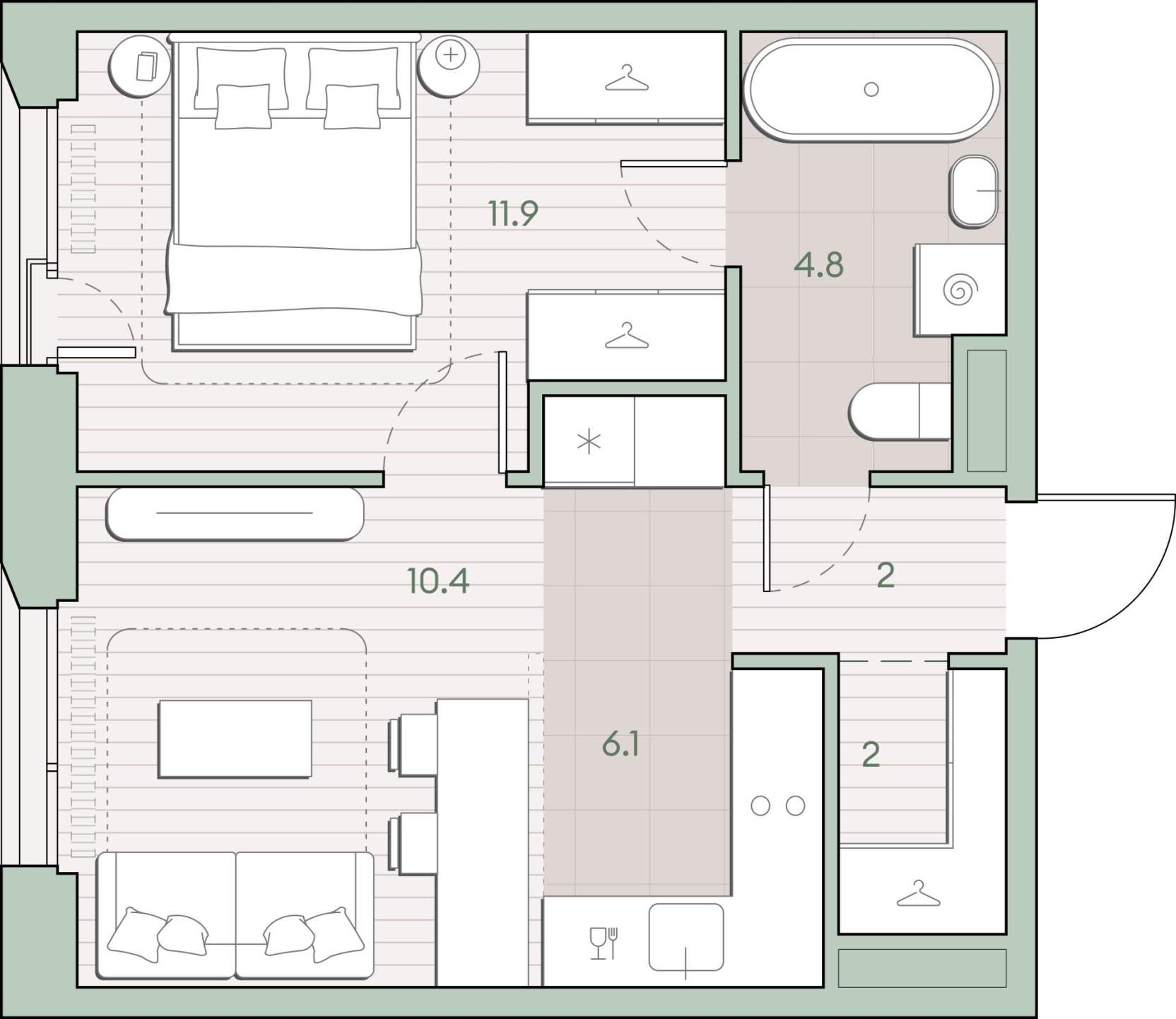 - Жилая площадь 22.3 м²