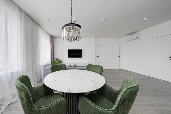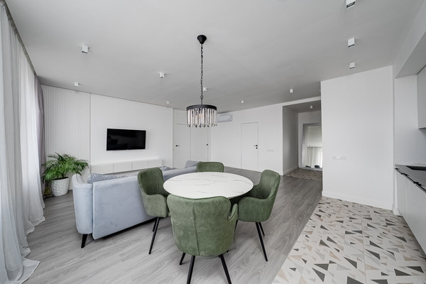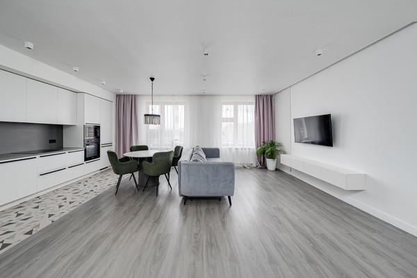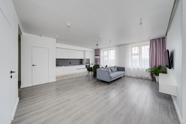 Удобная функциональная планировка: просторная кухня-гостиная, две изолированные спальни, гардеробная комната, совмещенный санузел;