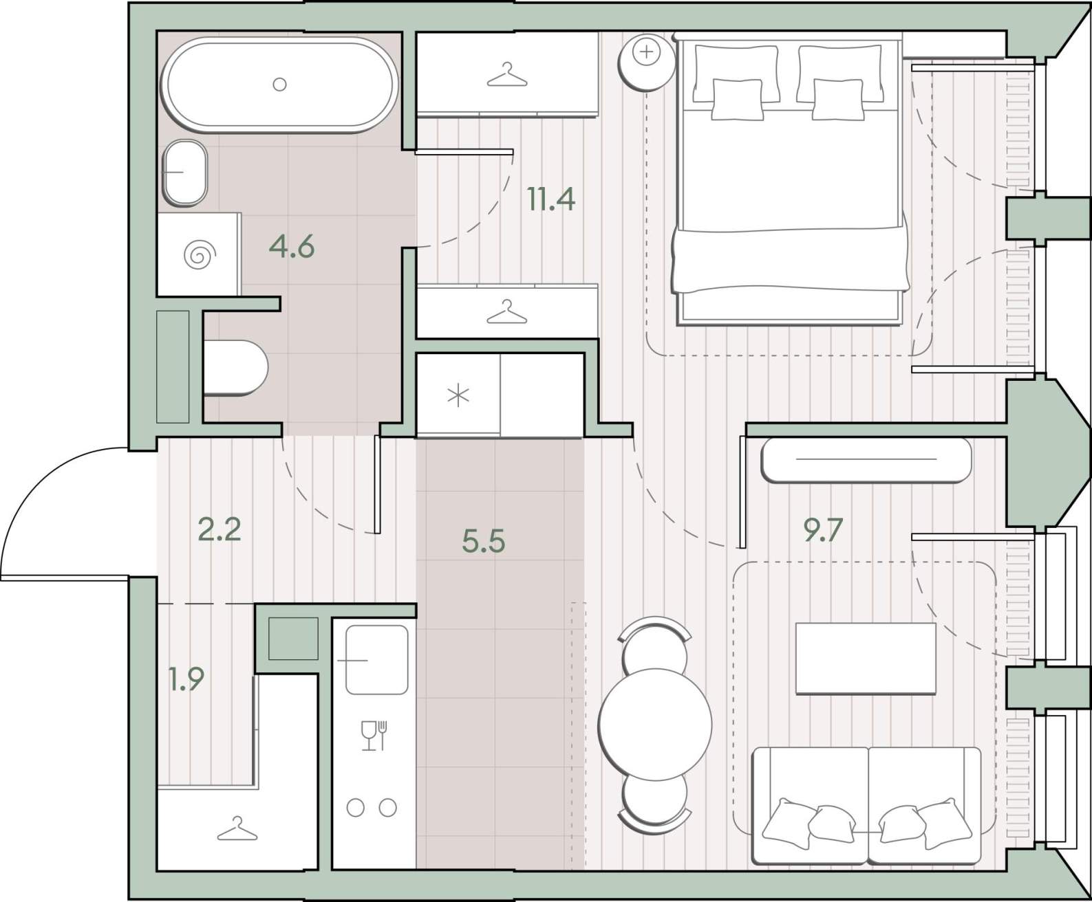 - Площадь кухни 5.5 м²