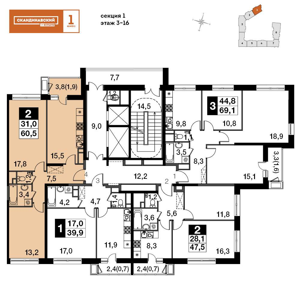 - Общая площадь 60.5 м²
