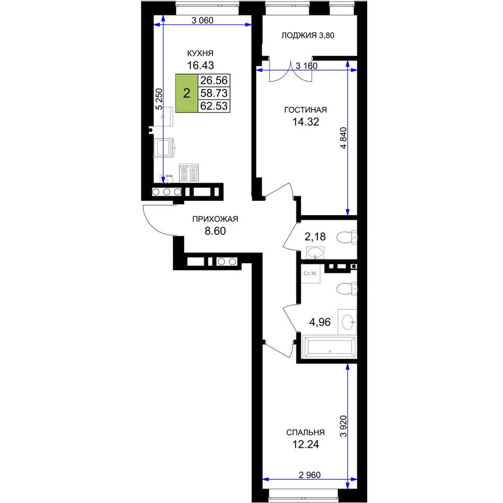 - Общая площадь 62.53 м²