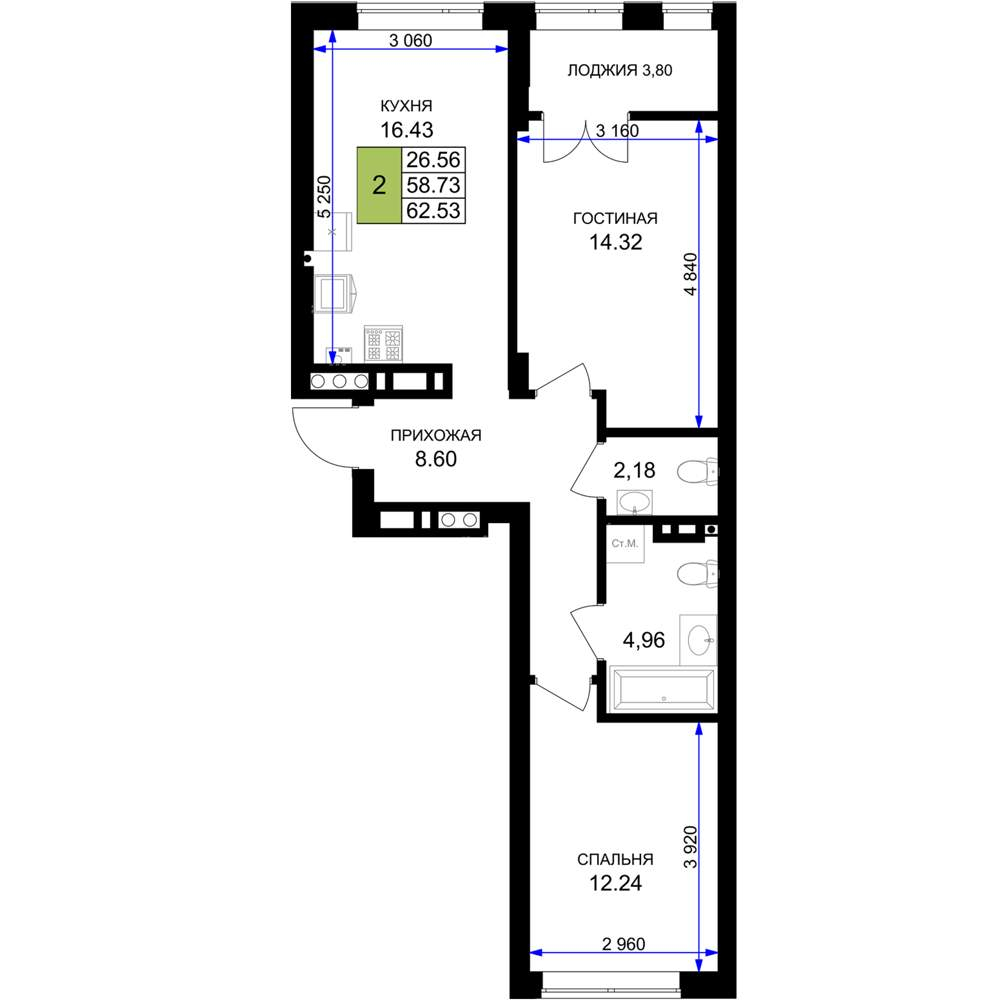 - Общая площадь 62.53 м²