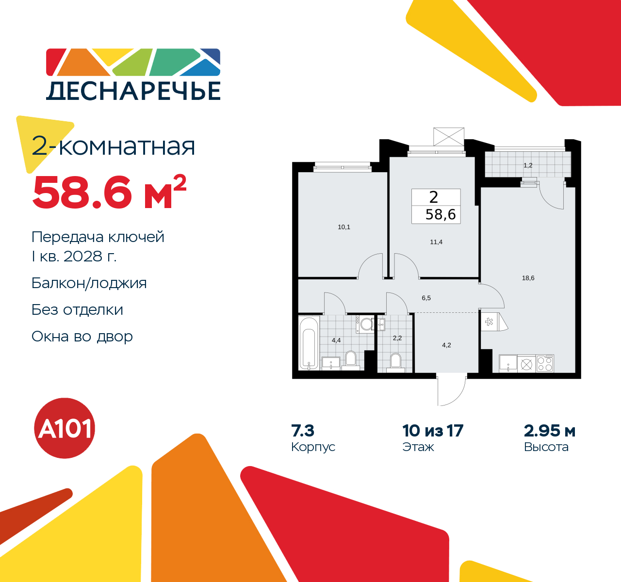 Продается двухкомнатная квартира от застройщика в ЖК "Деснаречье" на 10 этаже. Квартира без отделки, после оформления собственности можно делать ремонт. Общая площадь: 58.6 кв.м., жилая: 21.5 кв.м., площадь просторной кухни-столовой: 18.6 кв.м. Комнаты изолированные, все окна выходят на одну сторону. В квартире одна лоджия, один совмещенный и один раздельный санузел. Высота потолков 2.95 м. Эта квартира предлагается без отделки. Будут установлены стеклопакеты с повышенной тепло- и шумоизоляцией, в квартиру заведены все коммуникации. Вы сможете в полном объеме реализовать ваши идеи обустройства вашего комфортного дома. Для тех, кто ценит время и не хочет дополнительных трат на ремонт мы предлагаем квартиры с предчистовой и дизайнерской отделкой. Дом монолитный, черырехподъездный, переменной этажности, от 9 до 17 этажей. Квартира находится в 4-й секции высотой 16 этажей в корпусе 7.3. На этаже 5 квартир. В подъезде 1 пассажирский и 1 грузовой лифт. Начало строительства - 2 квартал 2025 года. Окончание строительства - 1 квартал 2028 года. Оформление сделки по договору долевого участия. Артикул квартиры по базе застройщика 88К-7.3-836. ПРЕДЛОЖЕНИЯ ОТ ЗАСТРОЙЩИКА В ОКТЯБРЕ 2025: Ипотека от 13,9 % для всех! На весь срок. "Семейная ипотека" вернулась. Ставка от 3,5 % на весь срок! Без удорожания! Выгодное ипотечное комбо: Ипотека от 2200 р./мес. и от 6 % после рождения ребёнка! Ипотека для всех "Держи пять!" - ставка 5 % на 2 года! *более подробную информацию по скидкам и акциям уточняйте в отделе продаж Масштабный проект "Деснаречье" на юго-западе Москвы, который включает три новых района («квартала»), объединённые общей идеей – воплотить в реальность мечты современных жителей столицы об интересном, комфортном и разноплановом городском пространстве в окружении рек и лесов, словно сошедших с полотен русских живописцев: - «Берег» оценят все, кому близка водная стихия: плеск волн, солнечные блики и прогулки вдоль тихого течения речи. - «Лес» утопает в зелени парков и лесов. Здесь соблюдён идеальный баланс загородного спокойствия и столичного комфорта. - «Парк», самый энергичный и яркий, отличается высокой концентрацией пространств для спорта и творчества. Жилой комплекс "Деснаречье" расположится в 12 км от МКАД по современному Калужскому шоссе. Внешний облик зданий соответствует современному стилю и стандартам, характерным и для других популярных проектов ГК «А101»: сочетание контрастных тонов, большое количество остекления, в котором отражается небо, гармония с природным окружением. Весь город - в вашем районе. Находиться на территории «15-минутного города» значит иметь всё необходимое для полноценной жизни в шаговой доступности. Маршруты в районе «Деснаречье» выстроены так, чтобы добраться до магазинов, парков, школ, салонов услуг и других объектов можно было всего за несколько минут пешком или на велосипеде. Двор закрытый от машин – это тишина, комфорт и безопасность, поэтому все машино-места (включая «семейные» и увеличенные, с возможностью установки роллетных шкафов) находятся в подземном паркинге. В паркинги можно спуститься на лифте из любого подъезда или по лестнице. Рядом с «Деснаречьем» в 2027 году планируется открытие станции метро «Десна», до которой будет удобно добраться пешком или на велосипеде. Дорога на автомобиле до перехватывающих парковок станций «Ольховая» и «Пр