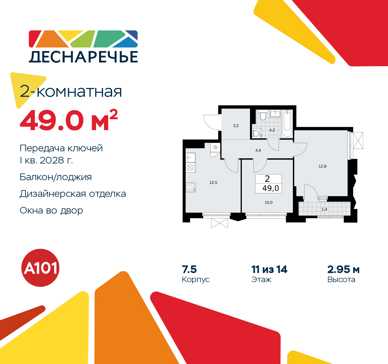 Двухкомнатная квартира от застройщика с отделкой в ЖК "Деснаречье" на 11 этаже. Общая площадь: 49 кв.м., жилая: 22.8 кв.м., площадь просторной кухни-столовой: 12.5 кв.м. Угловая квартира, идеально подойдет любителям тишины и панорамных видов. В квартире одна лоджия, один совмещенный санузел. Высота потолков 2.95 м. Эта квартира будет сдана с дизайнеркой отделкой "под ключ". Специально для вас мы разработали несколько решений дизайнерской отделки. В отделке используются только современный высококлассные материалы, на все работы предоставляется гарантия. В таком случае вы оплачиваете отделку в сегодняшних ценах, а эту стоимость вы можете разнести в ипотечных платежах. Дом монолитный, трехподъездный, переменной этажности, от 11 до 17 этажей. Квартира находится в 3-й секции высотой 14 этажей в корпусе 7.5. На этаже 5 квартир. В подъезде 1 пассажирский и 1 грузовой лифт. Начало строительства - 2 квартал 2025 года. Окончание строительства - 1 квартал 2028 года. Оформление сделки по договору долевого участия. Артикул квартиры по базе застройщика 88К-7.5-1198. ПРЕДЛОЖЕНИЯ ОТ ЗАСТРОЙЩИКА В ОКТЯБРЕ 2025: Ипотека от 13,9 % для всех! На весь срок. "Семейная ипотека" вернулась. Ставка от 3,5 % на весь срок! Без удорожания! Выгодное ипотечное комбо: Ипотека от 2200 р./мес. и от 6 % после рождения ребёнка! Ипотека для всех "Держи пять!" - ставка 5 % на 2 года! *более подробную информацию по скидкам и акциям уточняйте в отделе продаж Масштабный проект "Деснаречье" на юго-западе Москвы, который включает три новых района («квартала»), объединённые общей идеей – воплотить в реальность мечты современных жителей столицы об интересном, комфортном и разноплановом городском пространстве в окружении рек и лесов, словно сошедших с полотен русских живописцев: - «Берег» оценят все, кому близка водная стихия: плеск волн, солнечные блики и прогулки вдоль тихого течения речи. - «Лес» утопает в зелени парков и лесов. Здесь соблюдён идеальный баланс загородного спокойствия и столичного комфорта. - «Парк», самый энергичный и яркий, отличается высокой концентрацией пространств для спорта и творчества. Жилой комплекс "Деснаречье" расположится в 12 км от МКАД по современному Калужскому шоссе. Внешний облик зданий соответствует современному стилю и стандартам, характерным и для других популярных проектов ГК «А101»: сочетание контрастных тонов, большое количество остекления, в котором отражается небо, гармония с природным окружением. Весь город - в вашем районе. Находиться на территории «15-минутного города» значит иметь всё необходимое для полноценной жизни в шаговой доступности. Маршруты в районе «Деснаречье» выстроены так, чтобы добраться до магазинов, парков, школ, салонов услуг и других объектов можно было всего за несколько минут пешком или на велосипеде. Двор закрытый от машин – это тишина, комфорт и безопасность, поэтому все машино-места (включая «семейные» и увеличенные, с возможностью установки роллетных шкафов) находятся в подземном паркинге. В паркинги можно спуститься на лифте из любого подъезда или по лестнице. Рядом с «Деснаречьем» в 2027 году планируется открытие станции метро «Десна», до которой будет удобно добраться пешком или на велосипеде. Дорога на автомобиле до перехватывающих парковок станций «Ольховая» и «Прокшино» займёт около 10 минут. В процессе реализации проекта будут появляться нов