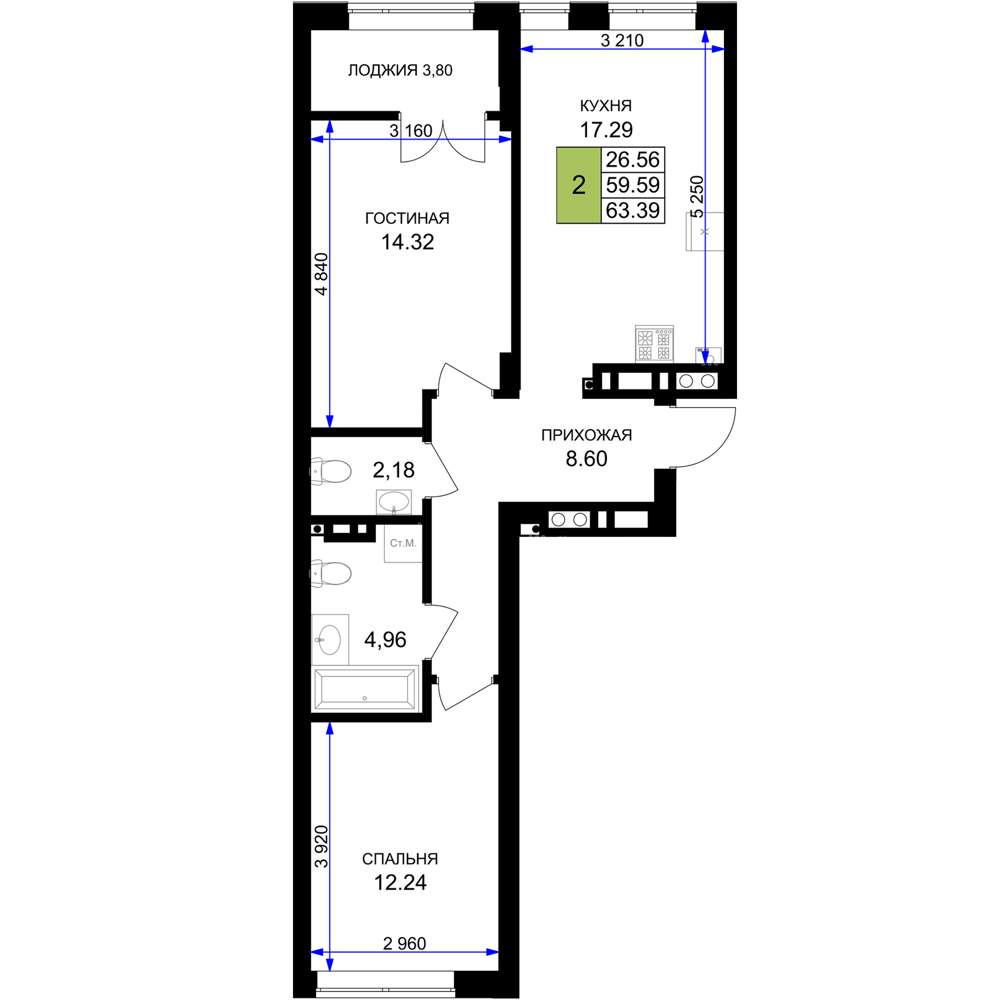 - Общая площадь 63.39 м²