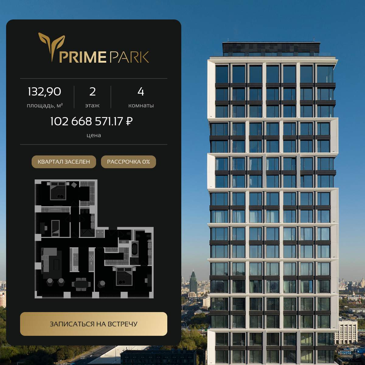 Продается 4-комн. квартира, площадью 132.9 м2 в монолитной новостройке в 12 мин. пешком от м. Динамо, район города - Хорошевский. Возможен вариант покупки с использованием ипотечных средств. Жилая площадь 85.5 м2, кухня 6.8 м2, предчистовая отделка, комнаты изолированные, окна выходят во двор. Квартира располагается на 2 этаже 41-этажного дома в ЖК Прайм Парк. Застройщик - Optima Development, сдача дома - II квартал 2022 года, дом уже сдан, высота потолков 3.1 м. Дом оборудован пассажирским лифтом. Подземная парковка, парковка охраняется. Обеспечение безопасности: консьерж. Инфраструктура: школа, детский сад, детские площадки, места для отдыха, супермаркет, рестораны, фитнес-центр. Премиальный квартал PRIME PARK стал одним из знаковых жилых проектов столицы, который задал новые ориентиры на рынке недвижимости. Он неизменно занимает лидирующие позиции по продажам в своем классе, стал рекордсменом по количеству завоеванных международных и российских премий в области недвижимости, а также был назван самым благоустроенным кварталом России на XIII Российской национальной премии по ландшафтной архитектуре. Квартал стал новой доминантой Ленинградского проспекта. Архитектор Филип Болл не только разработал концепцию бескомпромиссно роскошного жилья, но и на постоянной основе осуществляет авторский надзор. Небоскребы квартала отличаются уникальным рисунком фасадов и располагаются в отдалении друг от друга, что обеспечивает постоянный поток солнечного света и восхитительные виды из каждой квартиры. В то же время геометрия PRIME PARK продумана таким образом, чтобы создать атмосферу спокойствия и тишины на территории частного парка. 5 мин. от Тверской улицы, Патриарших прудов и Белой площади; 20 мин. до аэропорта «Шереметьево» или «Москва-Сити»; 4 парка - Ходынское поле, Петровский и Чапаевский парки, Березовая роща; 4 станции метро - «ЦСКА», «Аэропорт», «Динамо» и «Петровский парк». Аккредитованные банки: Абсолют Банк, Совкомбанк, Альфа-Банк, Банк ДОМ. РФ, Промсвязьбанк, Банк ВТБ, Россельхозбанк, МКБ. Позвоните и узнайте условия покупки прямо сейчас! [#7561273#]