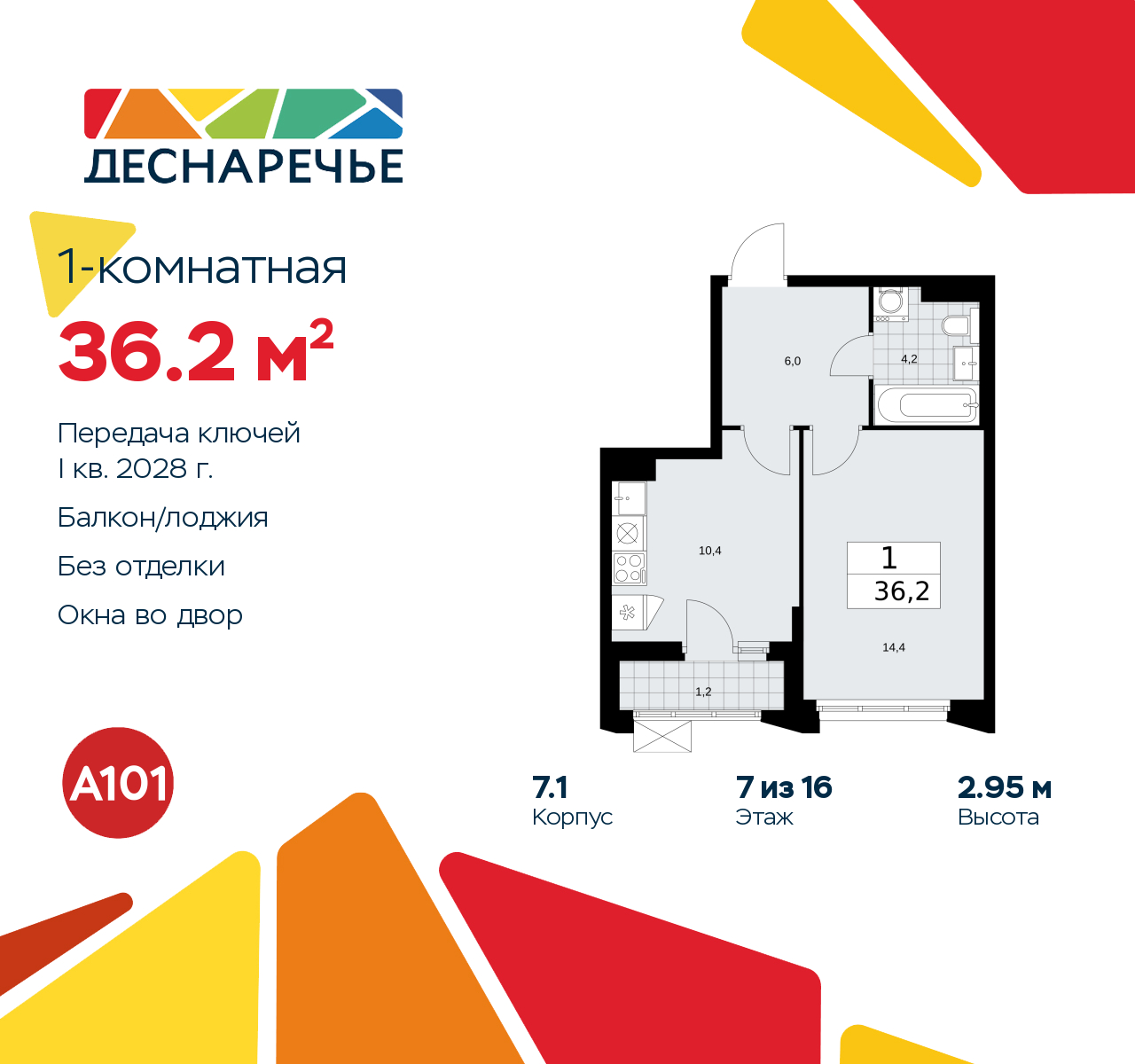 Однокомнатная квартира от застройщика в ЖК "Деснаречье" на 7 этаже. Квартира без отделки, после оформления собственности можно делать ремонт. Общая площадь: 36.2 кв.м., жилая: 14.4 кв.м., площадь просторной кухни-столовой: 10.4 кв.м. Все окна выходят на одну сторону. В квартире одна лоджия, один совмещенный санузел. Высота потолков 2.95 м. Эта квартира предлагается без отделки. Будут установлены стеклопакеты с повышенной тепло- и шумоизоляцией, в квартиру заведены все коммуникации. Вы сможете в полном объеме реализовать ваши идеи обустройства вашего комфортного дома. Для тех, кто ценит время и не хочет дополнительных трат на ремонт мы предлагаем квартиры с предчистовой и дизайнерской отделкой. Дом монолитный, многоподъездный, переменной этажности, от 8 до 16 этажей. Квартира находится в 4-й секции высотой 11 этажей в корпусе 7.1. На этаже 5 квартир. В подъезде 1 пассажирский и 1 грузовой лифт. Начало строительства - 2 квартал 2025 года. Окончание строительства - 1 квартал 2028 года. Оформление сделки по договору долевого участия. Артикул квартиры по базе застройщика 88К-7.1-220. ПРЕДЛОЖЕНИЯ ОТ ЗАСТРОЙЩИКА В ОКТЯБРЕ 2025: Ипотека от 13,9 % для всех! На весь срок. "Семейная ипотека" вернулась. Ставка от 3,5 % на весь срок! Без удорожания! Выгодное ипотечное комбо: Ипотека от 2200 р./мес. и от 6 % после рождения ребёнка! Ипотека для всех "Держи пять!" - ставка 5 % на 2 года! *более подробную информацию по скидкам и акциям уточняйте в отделе продаж Масштабный проект "Деснаречье" на юго-западе Москвы, который включает три новых района («квартала»), объединённые общей идеей – воплотить в реальность мечты современных жителей столицы об интересном, комфортном и разноплановом городском пространстве в окружении рек и лесов, словно сошедших с полотен русских живописцев: - «Берег» оценят все, кому близка водная стихия: плеск волн, солнечные блики и прогулки вдоль тихого течения речи. - «Лес» утопает в зелени парков и лесов. Здесь соблюдён идеальный баланс загородного спокойствия и столичного комфорта. - «Парк», самый энергичный и яркий, отличается высокой концентрацией пространств для спорта и творчества. Жилой комплекс "Деснаречье" расположится в 12 км от МКАД по современному Калужскому шоссе. Внешний облик зданий соответствует современному стилю и стандартам, характерным и для других популярных проектов ГК «А101»: сочетание контрастных тонов, большое количество остекления, в котором отражается небо, гармония с природным окружением. Весь город - в вашем районе. Находиться на территории «15-минутного города» значит иметь всё необходимое для полноценной жизни в шаговой доступности. Маршруты в районе «Деснаречье» выстроены так, чтобы добраться до магазинов, парков, школ, салонов услуг и других объектов можно было всего за несколько минут пешком или на велосипеде. Двор закрытый от машин – это тишина, комфорт и безопасность, поэтому все машино-места (включая «семейные» и увеличенные, с возможностью установки роллетных шкафов) находятся в подземном паркинге. В паркинги можно спуститься на лифте из любого подъезда или по лестнице. Рядом с «Деснаречьем» в 2027 году планируется открытие станции метро «Десна», до которой будет удобно добраться пешком или на велосипеде. Дорога на автомобиле до перехватывающих парковок станций «Ольховая» и «Прокшино» займёт около 10 минут. В процессе реализации пр
