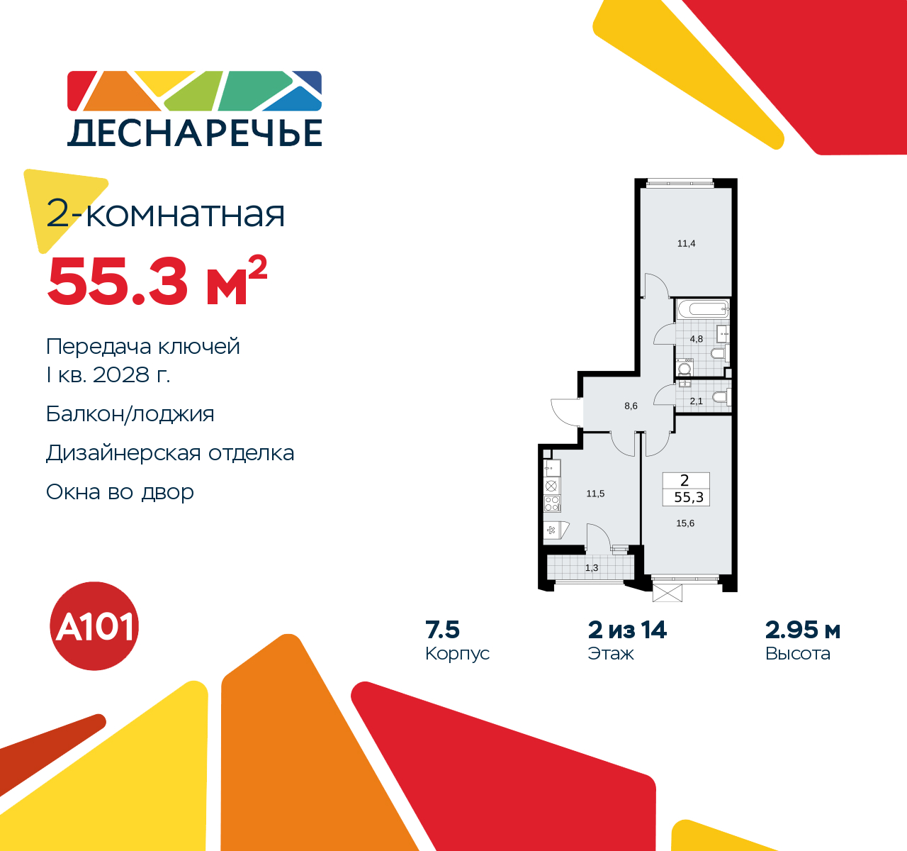 Двухкомнатная квартира от застройщика с отделкой в ЖК "Деснаречье" на 2 этаже. Общая площадь: 55.3 кв.м., жилая: 27 кв.м., площадь просторной кухни-столовой: 11.5 кв.м. Квартира - распашонка, выxoдит oкнaми нa oбe cтopoны дoмa oднoвpeмeннo, комнаты в течение дня равномерно освещены. В квартире одна лоджия, один совмещенный и один раздельный санузел. Высота потолков 2.95 м. Эта квартира будет сдана с дизайнеркой отделкой "под ключ". Специально для вас мы разработали несколько решений дизайнерской отделки. В отделке используются только современный высококлассные материалы, на все работы предоставляется гарантия. В таком случае вы оплачиваете отделку в сегодняшних ценах, а эту стоимость вы можете разнести в ипотечных платежах. Дом монолитный, трехподъездный, переменной этажности, от 11 до 17 этажей. Квартира находится во 2-й секции высотой 17 этажей в корпусе 7.5. На этаже 4 квартиры. В подъезде 1 пассажирский и 1 грузовой лифт. Начало строительства - 2 квартал 2025 года. Окончание строительства - 1 квартал 2028 года. Оформление сделки по договору долевого участия. Артикул квартиры по базе застройщика 88К-7.5-1112. ПРЕДЛОЖЕНИЯ ОТ ЗАСТРОЙЩИКА В ОКТЯБРЕ 2025: Ипотека от 13,9 % для всех! На весь срок. "Семейная ипотека" вернулась. Ставка от 3,5 % на весь срок! Без удорожания! Выгодное ипотечное комбо: Ипотека от 2200 р./мес. и от 6 % после рождения ребёнка! Ипотека для всех "Держи пять!" - ставка 5 % на 2 года! *более подробную информацию по скидкам и акциям уточняйте в отделе продаж Масштабный проект "Деснаречье" на юго-западе Москвы, который включает три новых района («квартала»), объединённые общей идеей – воплотить в реальность мечты современных жителей столицы об интересном, комфортном и разноплановом городском пространстве в окружении рек и лесов, словно сошедших с полотен русских живописцев: - «Берег» оценят все, кому близка водная стихия: плеск волн, солнечные блики и прогулки вдоль тихого течения речи. - «Лес» утопает в зелени парков и лесов. Здесь соблюдён идеальный баланс загородного спокойствия и столичного комфорта. - «Парк», самый энергичный и яркий, отличается высокой концентрацией пространств для спорта и творчества. Жилой комплекс "Деснаречье" расположится в 12 км от МКАД по современному Калужскому шоссе. Внешний облик зданий соответствует современному стилю и стандартам, характерным и для других популярных проектов ГК «А101»: сочетание контрастных тонов, большое количество остекления, в котором отражается небо, гармония с природным окружением. Весь город - в вашем районе. Находиться на территории «15-минутного города» значит иметь всё необходимое для полноценной жизни в шаговой доступности. Маршруты в районе «Деснаречье» выстроены так, чтобы добраться до магазинов, парков, школ, салонов услуг и других объектов можно было всего за несколько минут пешком или на велосипеде. Двор закрытый от машин – это тишина, комфорт и безопасность, поэтому все машино-места (включая «семейные» и увеличенные, с возможностью установки роллетных шкафов) находятся в подземном паркинге. В паркинги можно спуститься на лифте из любого подъезда или по лестнице. Рядом с «Деснаречьем» в 2027 году планируется открытие станции метро «Десна», до которой будет удобно добраться пешком или на велосипеде. Дорога на автомобиле до перехватывающих парковок станций «Ольховая» и «Прокшино» займёт около 10 минут. В 