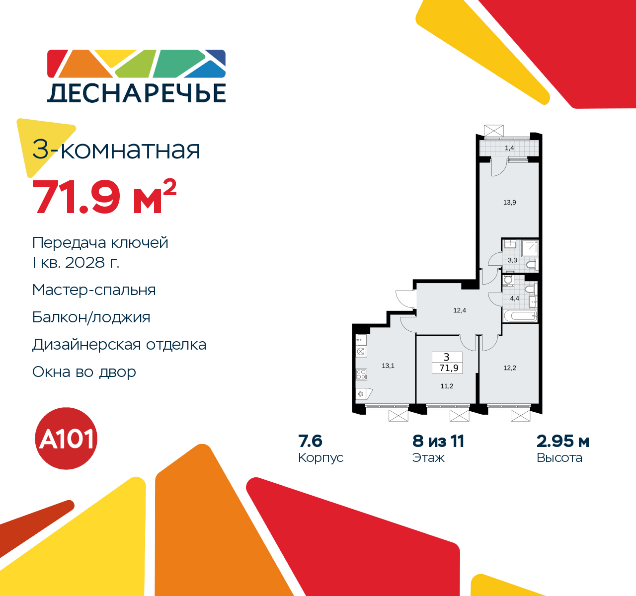 Трехкомнатная квартира от застройщика с отделкой в ЖК "Деснаречье" на 8 этаже. Общая площадь: 71.9 кв.м., жилая: 37.3 кв.м., площадь просторной кухни-столовой: 13.1 кв.м. Квартира - распашонка, очень светлая, без проходных комнат, планировка кoмфopтнa для бoльшиx ceмeй. В квартире одна лоджия, два совмещенных санузла. Высота потолков 2.95 м. Эта квартира будет сдана с дизайнеркой отделкой "под ключ". Специально для вас мы разработали несколько решений дизайнерской отделки. В отделке используются только современный высококлассные материалы, на все работы предоставляется гарантия. В таком случае вы оплачиваете отделку в сегодняшних ценах, а эту стоимость вы можете разнести в ипотечных платежах. Дом монолитный, двухподъездный, высотой 11 этажей. Квартира находится в 1-й секции в корпусе 7.6. На этаже 5 квартир. В подъезде 1 пассажирский и 1 грузовой лифт. Начало строительства - 2 квартал 2025 года. Окончание строительства - 1 квартал 2028 года. Оформление сделки по договору долевого участия. Артикул квартиры по базе застройщика 88К-7.6-1248. ПРЕДЛОЖЕНИЯ ОТ ЗАСТРОЙЩИКА В ОКТЯБРЕ 2025: Ипотека от 13,9 % для всех! На весь срок. "Семейная ипотека" вернулась. Ставка от 3,5 % на весь срок! Без удорожания! Выгодное ипотечное комбо: Ипотека от 2200 р./мес. и от 6 % после рождения ребёнка! Ипотека для всех "Держи пять!" - ставка 5 % на 2 года! *более подробную информацию по скидкам и акциям уточняйте в отделе продаж Масштабный проект "Деснаречье" на юго-западе Москвы, который включает три новых района («квартала»), объединённые общей идеей – воплотить в реальность мечты современных жителей столицы об интересном, комфортном и разноплановом городском пространстве в окружении рек и лесов, словно сошедших с полотен русских живописцев: - «Берег» оценят все, кому близка водная стихия: плеск волн, солнечные блики и прогулки вдоль тихого течения речи. - «Лес» утопает в зелени парков и лесов. Здесь соблюдён идеальный баланс загородного спокойствия и столичного комфорта. - «Парк», самый энергичный и яркий, отличается высокой концентрацией пространств для спорта и творчества. Жилой комплекс "Деснаречье" расположится в 12 км от МКАД по современному Калужскому шоссе. Внешний облик зданий соответствует современному стилю и стандартам, характерным и для других популярных проектов ГК «А101»: сочетание контрастных тонов, большое количество остекления, в котором отражается небо, гармония с природным окружением. Весь город - в вашем районе. Находиться на территории «15-минутного города» значит иметь всё необходимое для полноценной жизни в шаговой доступности. Маршруты в районе «Деснаречье» выстроены так, чтобы добраться до магазинов, парков, школ, салонов услуг и других объектов можно было всего за несколько минут пешком или на велосипеде. Двор закрытый от машин – это тишина, комфорт и безопасность, поэтому все машино-места (включая «семейные» и увеличенные, с возможностью установки роллетных шкафов) находятся в подземном паркинге. В паркинги можно спуститься на лифте из любого подъезда или по лестнице. Рядом с «Деснаречьем» в 2027 году планируется открытие станции метро «Десна», до которой будет удобно добраться пешком или на велосипеде. Дорога на автомобиле до перехватывающих парковок станций «Ольховая» и «Прокшино» займёт около 10 минут. В процессе реализации проекта будут появляться новые маршруты общест