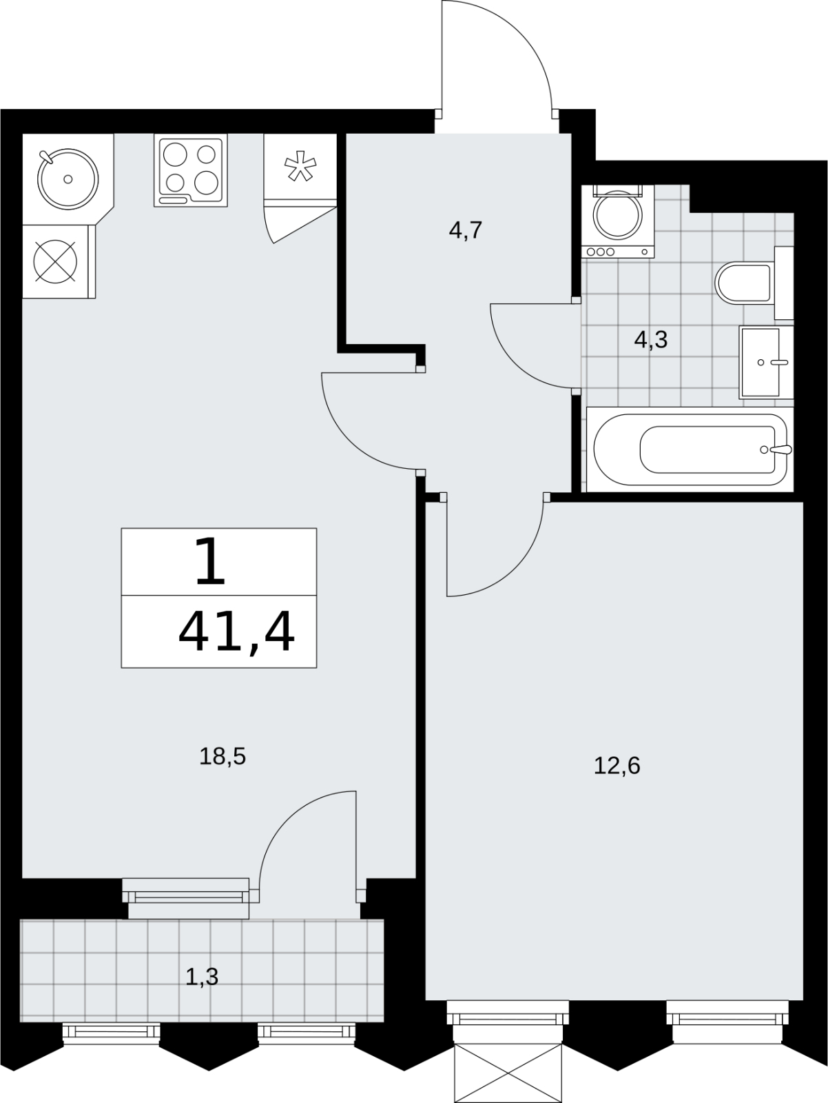 - Общая площадь 41.4 м²