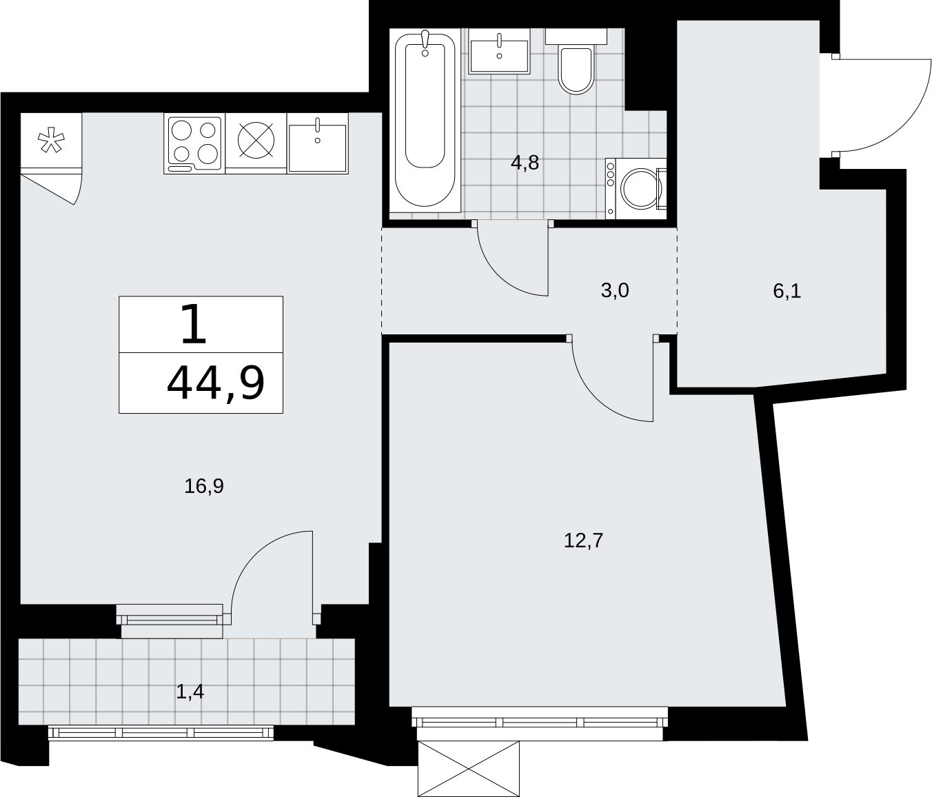 Просторная 1-комн. квартира в ЖК "Деснаречье" на 3 этаже. Квартира без отделки, полностью готова к чистовой отделке и дальнейшему ремонту. Общая площадь: 44.9 кв.м., жилая: 12.7 кв.м., площадь просторной кухни-столовой: 16.9 кв.м. Угловая квартира, окна oбecпeчивaют paвнoмepнoe ocвeщeниe в тeчeниe дня. В квартире одна лоджия, один совмещенный санузел. Высота потолков 2.95 м. Эта квартира предлагается без отделки. Будут установлены стеклопакеты с повышенной тепло- и шумоизоляцией, в квартиру заведены все коммуникации. Вы сможете в полном объеме реализовать ваши идеи обустройства вашего комфортного дома. Для тех, кто ценит время и не хочет дополнительных трат на ремонт мы предлагаем квартиры с предчистовой и дизайнерской отделкой. Дом монолитный, многоподъездный, переменной этажности, от 8 до 16 этажей. Квартира находится в 6-й секции высотой 16 этажей в корпусе 7.1. На этаже 6 квартир. В подъезде 1 пассажирский и 1 грузовой лифт. Начало строительства - 2 квартал 2025 года. Окончание строительства - 1 квартал 2028 года. Оформление сделки по договору долевого участия. Артикул квартиры по базе застройщика 88К-7.1-285. ПРЕДЛОЖЕНИЯ ОТ ЗАСТРОЙЩИКА В ОКТЯБРЕ 2025: Ипотека от 13,9 % для всех! На весь срок. "Семейная ипотека" вернулась. Ставка от 3,5 % на весь срок! Без удорожания! Выгодное ипотечное комбо: Ипотека от 2200 р./мес. и от 6 % после рождения ребёнка! Ипотека для всех "Держи пять!" - ставка 5 % на 2 года! *более подробную информацию по скидкам и акциям уточняйте в отделе продаж Масштабный проект "Деснаречье" на юго-западе Москвы, который включает три новых района («квартала»), объединённые общей идеей – воплотить в реальность мечты современных жителей столицы об интересном, комфортном и разноплановом городском пространстве в окружении рек и лесов, словно сошедших с полотен русских живописцев: - «Берег» оценят все, кому близка водная стихия: плеск волн, солнечные блики и прогулки вдоль тихого течения речи. - «Лес» утопает в зелени парков и лесов. Здесь соблюдён идеальный баланс загородного спокойствия и столичного комфорта. - «Парк», самый энергичный и яркий, отличается высокой концентрацией пространств для спорта и творчества. Жилой комплекс "Деснаречье" расположится в 12 км от МКАД по современному Калужскому шоссе. Внешний облик зданий соответствует современному стилю и стандартам, характерным и для других популярных проектов ГК «А101»: сочетание контрастных тонов, большое количество остекления, в котором отражается небо, гармония с природным окружением. Весь город - в вашем районе. Находиться на территории «15-минутного города» значит иметь всё необходимое для полноценной жизни в шаговой доступности. Маршруты в районе «Деснаречье» выстроены так, чтобы добраться до магазинов, парков, школ, салонов услуг и других объектов можно было всего за несколько минут пешком или на велосипеде. Двор закрытый от машин – это тишина, комфорт и безопасность, поэтому все машино-места (включая «семейные» и увеличенные, с возможностью установки роллетных шкафов) находятся в подземном паркинге. В паркинги можно спуститься на лифте из любого подъезда или по лестнице. Рядом с «Деснаречьем» в 2027 году планируется открытие станции метро «Десна», до которой будет удобно добраться пешком или на велосипеде. Дорога на автомобиле до перехватывающих парковок станций «Ольховая» и «Прокшино» займёт около 10 минут. В