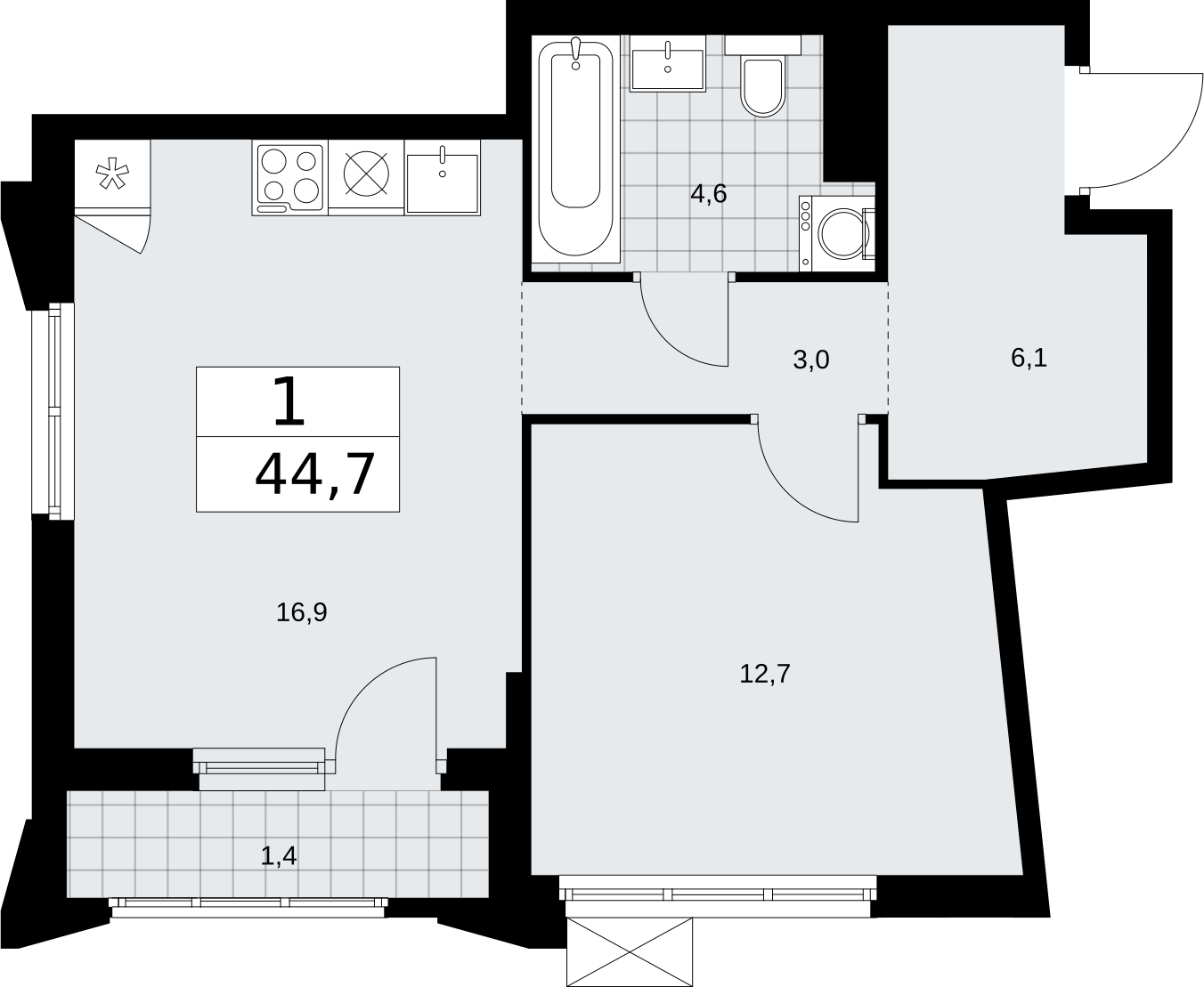 Однокомнатная квартира в ЖК "Деснаречье" на 15 этаже. Квартира без отделки, после получения ключей можно делать ремонт. Общая площадь: 44.7 кв.м., жилая: 12.7 кв.м., площадь просторной кухни-столовой: 16.9 кв.м. Угловая квартира, очень светлая, естественная вентиляция при открытии окон. В квартире одна лоджия, один совмещенный санузел. Высота потолков 2.95 м. Эта квартира предлагается без отделки. Будут установлены стеклопакеты с повышенной тепло- и шумоизоляцией, в квартиру заведены все коммуникации. Вы сможете в полном объеме реализовать ваши идеи обустройства вашего комфортного дома. Для тех, кто ценит время и не хочет дополнительных трат на ремонт мы предлагаем квартиры с предчистовой и дизайнерской отделкой. Дом монолитный, многоподъездный, переменной этажности, от 8 до 16 этажей. Квартира находится в 6-й секции высотой 16 этажей в корпусе 7.1. На этаже 6 квартир. В подъезде 1 пассажирский и 1 грузовой лифт. Начало строительства - 2 квартал 2025 года. Окончание строительства - 1 квартал 2028 года. Оформление сделки по договору долевого участия. Артикул квартиры по базе застройщика 88К-7.1-357. ПРЕДЛОЖЕНИЯ ОТ ЗАСТРОЙЩИКА В ОКТЯБРЕ 2025: Ипотека от 13,9 % для всех! На весь срок. "Семейная ипотека" вернулась. Ставка от 3,5 % на весь срок! Без удорожания! Выгодное ипотечное комбо: Ипотека от 2200 р./мес. и от 6 % после рождения ребёнка! Ипотека для всех "Держи пять!" - ставка 5 % на 2 года! *более подробную информацию по скидкам и акциям уточняйте в отделе продаж Масштабный проект "Деснаречье" на юго-западе Москвы, который включает три новых района («квартала»), объединённые общей идеей – воплотить в реальность мечты современных жителей столицы об интересном, комфортном и разноплановом городском пространстве в окружении рек и лесов, словно сошедших с полотен русских живописцев: - «Берег» оценят все, кому близка водная стихия: плеск волн, солнечные блики и прогулки вдоль тихого течения речи. - «Лес» утопает в зелени парков и лесов. Здесь соблюдён идеальный баланс загородного спокойствия и столичного комфорта. - «Парк», самый энергичный и яркий, отличается высокой концентрацией пространств для спорта и творчества. Жилой комплекс "Деснаречье" расположится в 12 км от МКАД по современному Калужскому шоссе. Внешний облик зданий соответствует современному стилю и стандартам, характерным и для других популярных проектов ГК «А101»: сочетание контрастных тонов, большое количество остекления, в котором отражается небо, гармония с природным окружением. Весь город - в вашем районе. Находиться на территории «15-минутного города» значит иметь всё необходимое для полноценной жизни в шаговой доступности. Маршруты в районе «Деснаречье» выстроены так, чтобы добраться до магазинов, парков, школ, салонов услуг и других объектов можно было всего за несколько минут пешком или на велосипеде. Двор закрытый от машин – это тишина, комфорт и безопасность, поэтому все машино-места (включая «семейные» и увеличенные, с возможностью установки роллетных шкафов) находятся в подземном паркинге. В паркинги можно спуститься на лифте из любого подъезда или по лестнице. Рядом с «Деснаречьем» в 2027 году планируется открытие станции метро «Десна», до которой будет удобно добраться пешком или на велосипеде. Дорога на автомобиле до перехватывающих парковок станций «Ольховая» и «Прокшино» займёт около 10 минут. В про