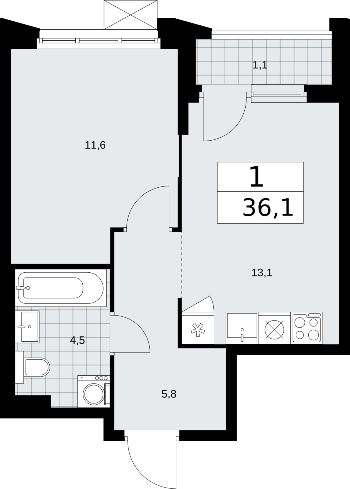 - Общая площадь 36.1 м²