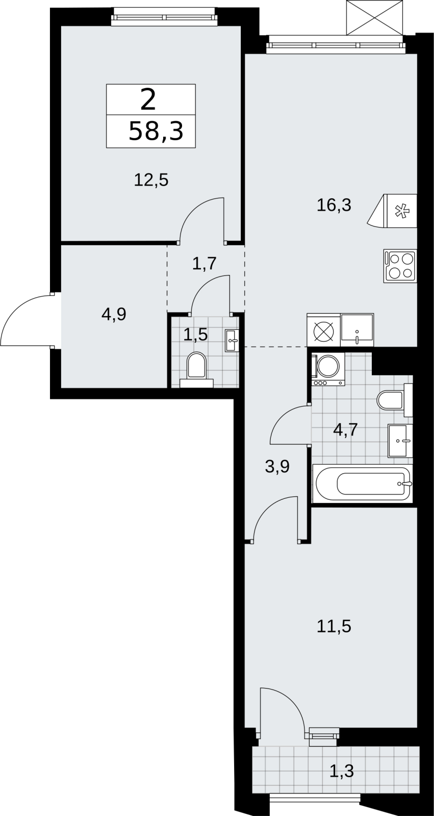 - Общая площадь 58.3 м²