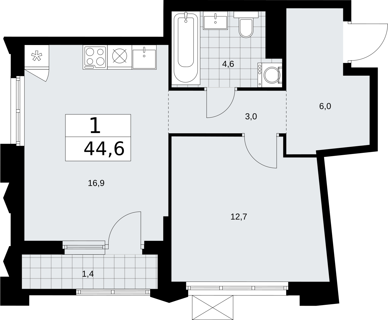 1-комн. квартира в ЖК "Деснаречье" на 11 этаже. Квартира без отделки, после оформления собственности можно делать ремонт. Общая площадь: 44.6 кв.м., жилая: 12.7 кв.м., площадь просторной кухни-столовой: 16.9 кв.м. Угловая квартира, идеально подойдет любителям тишины и панорамных видов. В квартире одна лоджия, один совмещенный санузел. Высота потолков 2.95 м. Эта квартира предлагается без отделки. Будут установлены стеклопакеты с повышенной тепло- и шумоизоляцией, в квартиру заведены все коммуникации. Вы сможете в полном объеме реализовать ваши идеи обустройства вашего комфортного дома. Для тех, кто ценит время и не хочет дополнительных трат на ремонт мы предлагаем квартиры с предчистовой и дизайнерской отделкой. Дом монолитный, черырехподъездный, переменной этажности, от 9 до 17 этажей. Квартира находится в 3-й секции высотой 17 этажей в корпусе 7.3. На этаже 5 квартир. В подъезде 1 пассажирский и 1 грузовой лифт. Начало строительства - 2 квартал 2025 года. Окончание строительства - 1 квартал 2028 года. Оформление сделки по договору долевого участия. Артикул квартиры по базе застройщика 88К-7.3-753. ПРЕДЛОЖЕНИЯ ОТ ЗАСТРОЙЩИКА В ОКТЯБРЕ 2025: Ипотека от 13,9 % для всех! На весь срок. "Семейная ипотека" вернулась. Ставка от 3,5 % на весь срок! Без удорожания! Выгодное ипотечное комбо: Ипотека от 2200 р./мес. и от 6 % после рождения ребёнка! Ипотека для всех "Держи пять!" - ставка 5 % на 2 года! *более подробную информацию по скидкам и акциям уточняйте в отделе продаж Масштабный проект "Деснаречье" на юго-западе Москвы, который включает три новых района («квартала»), объединённые общей идеей – воплотить в реальность мечты современных жителей столицы об интересном, комфортном и разноплановом городском пространстве в окружении рек и лесов, словно сошедших с полотен русских живописцев: - «Берег» оценят все, кому близка водная стихия: плеск волн, солнечные блики и прогулки вдоль тихого течения речи. - «Лес» утопает в зелени парков и лесов. Здесь соблюдён идеальный баланс загородного спокойствия и столичного комфорта. - «Парк», самый энергичный и яркий, отличается высокой концентрацией пространств для спорта и творчества. Жилой комплекс "Деснаречье" расположится в 12 км от МКАД по современному Калужскому шоссе. Внешний облик зданий соответствует современному стилю и стандартам, характерным и для других популярных проектов ГК «А101»: сочетание контрастных тонов, большое количество остекления, в котором отражается небо, гармония с природным окружением. Весь город - в вашем районе. Находиться на территории «15-минутного города» значит иметь всё необходимое для полноценной жизни в шаговой доступности. Маршруты в районе «Деснаречье» выстроены так, чтобы добраться до магазинов, парков, школ, салонов услуг и других объектов можно было всего за несколько минут пешком или на велосипеде. Двор закрытый от машин – это тишина, комфорт и безопасность, поэтому все машино-места (включая «семейные» и увеличенные, с возможностью установки роллетных шкафов) находятся в подземном паркинге. В паркинги можно спуститься на лифте из любого подъезда или по лестнице. Рядом с «Деснаречьем» в 2027 году планируется открытие станции метро «Десна», до которой будет удобно добраться пешком или на велосипеде. Дорога на автомобиле до перехватывающих парковок станций «Ольховая» и «Прокшино» займёт около 10 минут. В про