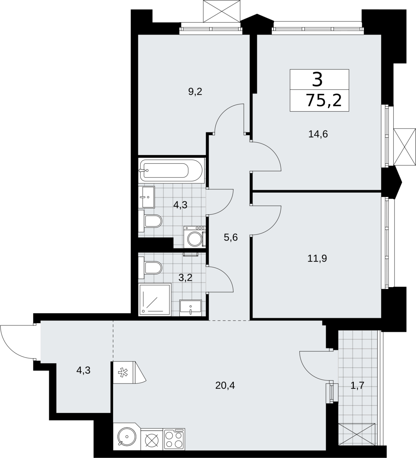 - Общая площадь 75.2 м²