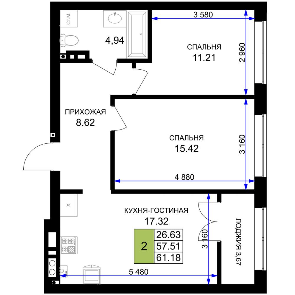 - Общая площадь 61.18 м²