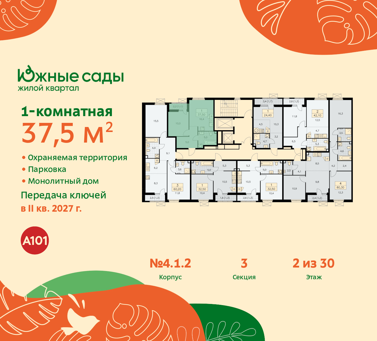 1-комн. квартира с отделкой в ЖК "Южные сады" на 2 этаже. Общая площадь: 37.5 кв.м. Высота потолков 2.95 м. Дом монолитный, черырехподъездный, переменной этажности, от 11 до 30 этажей. Квартира находится во 2-й секции высотой 11 этажей в корпусе 4.1.2. На этаже 7 квартир. В подъезде 1 пассажирский и 1 грузовой лифт. Начало строительства - 2 квартал 2024 года. Окончание строительства - 2 квартал 2027 года. Оформление сделки по договору долевого участия. Артикул квартиры по базе застройщика 99К-4.1.2-205. В шаговой доступности от жилого комплекса имеются станции метро (расстояние по прямой): «Бунинская аллея» (1.0 км), «Улица Горчакова» (1.2 км), «Потапово» (1.6 км), «Бульвар адмирала Ушакова» (1.8 км). ПРЕДЛОЖЕНИЯ ОТ ЗАСТРОЙЩИКА В ОКТЯБРЕ 2025: Ипотека от 13,9 % для всех! На весь срок. "Семейная ипотека" вернулась. Ставка от 3,5 % на весь срок! Без удорожания! Выгодное ипотечное комбо: Ипотека от 2200 р./мес. и от 6 % после рождения ребёнка! Ипотека для всех "Держи пять!" - ставка 5 % на 2 года! *более подробную информацию по скидкам и акциям уточняйте в отделе продаж Новый проект "Южные сады" от застройщика "А101" будет построен на юге Москвы в пешей доступности от метро "Бунинская аллея". Дома будут возведены в окружении парков, а на территории комплекса будет выполнено благоустройство "Сады Средиземноморья" - тёплые оттенки и натуральные материалы покрытий, разнообразие плодовых и вечнозелёных деревьев, живые изгороди и эстетика средиземноморского сада. На первых этажах откроются магазины, кафе с летними террасами, фитнес-залы и салоны красоты. Для каждой группы домов фасады разработаны отдельно. Сочетание различных цветов и материалов привносит разнообразие и динамику в облик нового района. В отделке вентилируемых фасадов будут применяться качественные и долговечные материалы: штукатурка, облицовочная фасадная плитка разных размеров и текстур. Подъезды с витражным остеклением хорошо просматриваются со стороны двора. Естественное освещение днём и уютный вечерний свет создают ощущение «я дома» задолго до входа в квартиру, повышают комфорт и безопасность. Эксклюзивный авторский дизайн входных групп от Studio 211 созвучен природному окружению. Среди особенностей проекта московская прописка, школы и детские сады Южного Бутово, удобный выезд на СБВ. В каждой квартире предусмотрены летние помещения, просторные окна, высокие потолки. На ваш выбор застройщик предлагает как квартиры без отделки, с отделкой WHITE BOX, а также с дизайнерской отделкой. (AQID02475540)