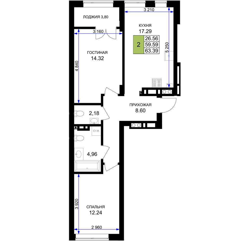 - Общая площадь 63.39 м²