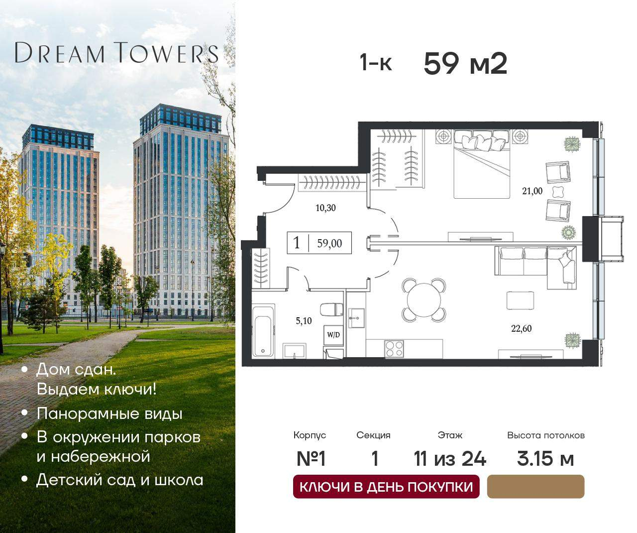 Рассрочка 0% от застройщика. Первоначальный взнос от 20%. Ключи в день покупки. ЖК Dream Towers проект премиум-класса в окружении парков и набережной, с полностью готовой инфраструктурой для комфортной жизни и отдыха. Продаётся 1-квартира на 11 этаже 24-этажного дома (1 корпус) . Общая площадь: 59 кв.м. Высота потолков от 3.15 м. Город-курорт на 100 Га в шаге от вашего дома: - пляжный комлекс Dream Beach Club; - парк аттракционов Остров Мечты; - 44 Га ландшафтных парков; - пешеходная набережная; - яхт-клуб; - Южный речной вокзал; - вейк-парк и многое другое. В Dream Towers предусмотрено все для комфортной жизни с семьей: - дизайнерские лобби с общественной гостиной, колясочной и лапомойками; - охраняемый благоустроенной двор только для жителей; - собственный десткий сад и школа прямо во дворе; - красивая архитектура зданий в стиле Ар-деко; - облицовка фасадов из натурального камня с архитектурной подсветкой; - широкоформатное остекление окон в пол для лучших видовых характеристик на парки и пойму Москвы-реки; - подземный паркинг; - клубный формат проживания; - эргономичные планировки от 40 до 162 м2; - высокие потолки от 3,15 до 4,1 м; - квартиры с террасами; - вся необходимая инфраструктура на первых этажах домов, а также в торговой части тематического парка "Остров Мечты" (рестораны, кафе, супермаркет, магазины, салон красоты, йога-студия и многое другое) . Центр рядом: 15 минут до Садового кольца на авто, 20 минут до Сити или Кремля. В 5 минутах прогулочным шагом - станция метро "Технопарк". [#7532242#]