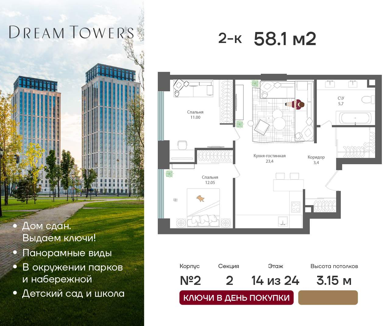 Рассрочка 0% от застройщика. Первоначальный взнос от 20%. Ключи в день покупки. ЖК Dream Towers проект премиум-класса в окружении парков и набережной, с полностью готовой инфраструктурой для комфортной жизни и отдыха. Продаётся 2-квартира на 14 этаже 24-этажного дома (2 корпус) . Общая площадь: 58.1 кв.м. Высота потолков от 3.15 м. Город-курорт на 100 Га в шаге от вашего дома: - пляжный комлекс Dream Beach Club; - парк аттракционов Остров Мечты; - 44 Га ландшафтных парков; - пешеходная набережная; - яхт-клуб; - Южный речной вокзал; - вейк-парк и многое другое. В Dream Towers предусмотрено все для комфортной жизни с семьей: - дизайнерские лобби с общественной гостиной, колясочной и лапомойками; - охраняемый благоустроенной двор только для жителей; - собственный десткий сад и школа прямо во дворе; - красивая архитектура зданий в стиле Ар-деко; - облицовка фасадов из натурального камня с архитектурной подсветкой; - широкоформатное остекление окон в пол для лучших видовых характеристик на парки и пойму Москвы-реки; - подземный паркинг; - клубный формат проживания; - эргономичные планировки от 40 до 162 м2; - высокие потолки от 3,15 до 4,1 м; - квартиры с террасами; - вся необходимая инфраструктура на первых этажах домов, а также в торговой части тематического парка "Остров Мечты" (рестораны, кафе, супермаркет, магазины, салон красоты, йога-студия и многое другое) . Центр рядом: 15 минут до Садового кольца на авто, 20 минут до Сити или Кремля. В 5 минутах прогулочным шагом - станция метро "Технопарк". [#7545563#]