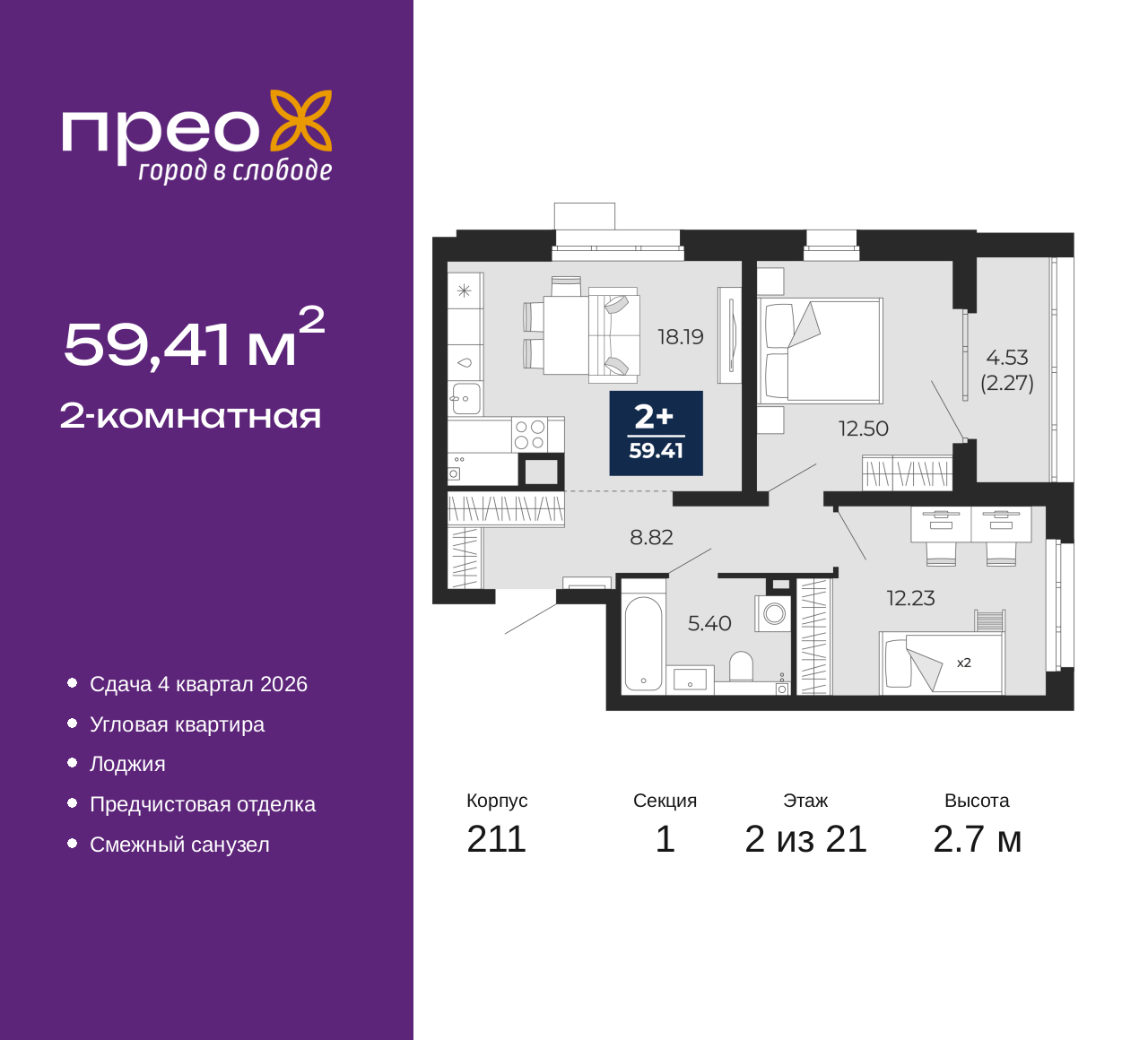 Двухкомнатная квартира с предчистовой отделкой в ЖК "Прео" на 2 этаже. Общая площадь: 59.41 кв.м., жилая: 24.73 кв.м., площадь просторной кухни-столовой: 18.19 кв.м. Квартира угловая, очень светлая, естественная вентиляция при открытии окон. В квартире одна лоджия, один совмещенный санузел. Высота потолков 2.7 м. Дом монолитный, черырехподъездный, переменной этажности, от 14 до 21 этажей. Квартира находится в 1-й секции высотой 21 этаж в корпусе 211. На этаже 8 квартир. В подъезде 1 пассажирский и 1 грузовой лифт. Окончание строительства - 4 квартал 2026 года. Оформление сделки по договору долевого участия. Преображенский — один из самых привлекательных районов для жизни! Это полностью самостоятельный жилой район с точки зрения инфраструктуры. Преображенский находится между Московским и Червишевским трактами в квартале улиц Закалужская — Вьюжная — Александра Протозанова. Не нужно ждать, когда появится инфраструктура — переезжайте на всё готовое. Вблизи расположены действующие школа и детский сад. В этом году откроется еще один сад, а в следующем году — школа. По соседству с Преображенским запланировано строительство городского парка «Комарово» площадью 38 гектар. За 10 минут можно доехать на автомобиле до крупных ТРЦ: «Лента», «Кристалл», «Леруа Мерлен», «Метро» и «Ашан». С 2018 года в районе открыт Соседский центр — пространство, созданное для формирования добрососедской среды, совместного досуга, общения и реализации соседских инициатив. Здесь проходят встречи соседей, а также сами жители района организовывают мероприятия. Организатором такого события может стать любой желающий. В квартирах выполнена качественная предчистовая отделка. Гладкие стены с финишным выравниванием по маякам. Ровный потолок для установки натяжного потолка. Установлены пятикамерные окна с двойным стеклопакетом (3 стекла). Дизайнерские холлы с видеонаблюдением, безбарьерным и прозрачным входом – всегда светло и спокойно. На первом этаже есть просторные колясочные, где все жители могут оставлять свои коляски и велосипеды. В Преображенском есть всё, что нужно для активного отдыха и занятий спортом. Мы сделали большое футбольное поле с безопасным покрытием. Также установили хоккейный корт, который оборудован по всем необходимым стандартам. Во дворах можно делать упражнения на специальных площадках с турниками. Весь район мы обустроили велодорожками, которые связаны в единый маршрут. У нас есть сухие фонтаны, бьющие из земли, деревья, веревки, сетки, скалодром, газон, песок и резинка — осталось просто дать своему ребенку право на свободную игру. По-настоящему хорошие дворы — это те, которые дети предпочитают соцсетям и телевизору. Аккредитация в банках: ПАО «Газпромбанк», ПАО Банк «ВТБ», ОАО «Альфа-Банк», «Сбербанк России», ПАО «Банк Уралсиб» и других. (AQID02427640)