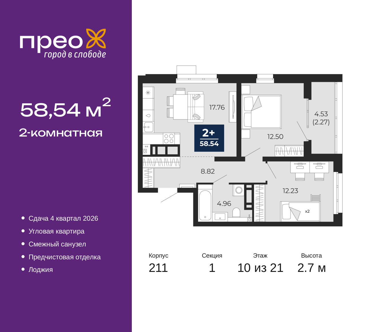 Просторная 2-комн. квартира с предчистовой отделкой в ЖК "Прео" на 10 этаже. Общая площадь: 58.54 кв.м., жилая: 24.73 кв.м., площадь просторной кухни-столовой: 17.76 кв.м. Квартира угловая, идеально подойдет любителям тишины и панорамных видов. В квартире одна лоджия, один совмещенный санузел. Высота потолков 2.7 м. Дом монолитный, черырехподъездный, переменной этажности, от 14 до 21 этажей. Квартира находится в 1-й секции высотой 21 этаж в корпусе 211. На этаже 8 квартир. В подъезде 1 пассажирский и 1 грузовой лифт. Окончание строительства - 4 квартал 2026 года. Оформление сделки по договору долевого участия. Преображенский — один из самых привлекательных районов для жизни! Это полностью самостоятельный жилой район с точки зрения инфраструктуры. Преображенский находится между Московским и Червишевским трактами в квартале улиц Закалужская — Вьюжная — Александра Протозанова. Не нужно ждать, когда появится инфраструктура — переезжайте на всё готовое. Вблизи расположены действующие школа и детский сад. В этом году откроется еще один сад, а в следующем году — школа. По соседству с Преображенским запланировано строительство городского парка «Комарово» площадью 38 гектар. За 10 минут можно доехать на автомобиле до крупных ТРЦ: «Лента», «Кристалл», «Леруа Мерлен», «Метро» и «Ашан». С 2018 года в районе открыт Соседский центр — пространство, созданное для формирования добрососедской среды, совместного досуга, общения и реализации соседских инициатив. Здесь проходят встречи соседей, а также сами жители района организовывают мероприятия. Организатором такого события может стать любой желающий. В квартирах выполнена качественная предчистовая отделка. Гладкие стены с финишным выравниванием по маякам. Ровный потолок для установки натяжного потолка. Установлены пятикамерные окна с двойным стеклопакетом (3 стекла). Дизайнерские холлы с видеонаблюдением, безбарьерным и прозрачным входом – всегда светло и спокойно. На первом этаже есть просторные колясочные, где все жители могут оставлять свои коляски и велосипеды. В Преображенском есть всё, что нужно для активного отдыха и занятий спортом. Мы сделали большое футбольное поле с безопасным покрытием. Также установили хоккейный корт, который оборудован по всем необходимым стандартам. Во дворах можно делать упражнения на специальных площадках с турниками. Весь район мы обустроили велодорожками, которые связаны в единый маршрут. У нас есть сухие фонтаны, бьющие из земли, деревья, веревки, сетки, скалодром, газон, песок и резинка — осталось просто дать своему ребенку право на свободную игру. По-настоящему хорошие дворы — это те, которые дети предпочитают соцсетям и телевизору. Аккредитация в банках: «Сбербанк России», ПАО «Газпромбанк», ПАО Банк «ВТБ», ОАО «Альфа-Банк», ПАО «Банк Уралсиб» и других. (AQID02427647)