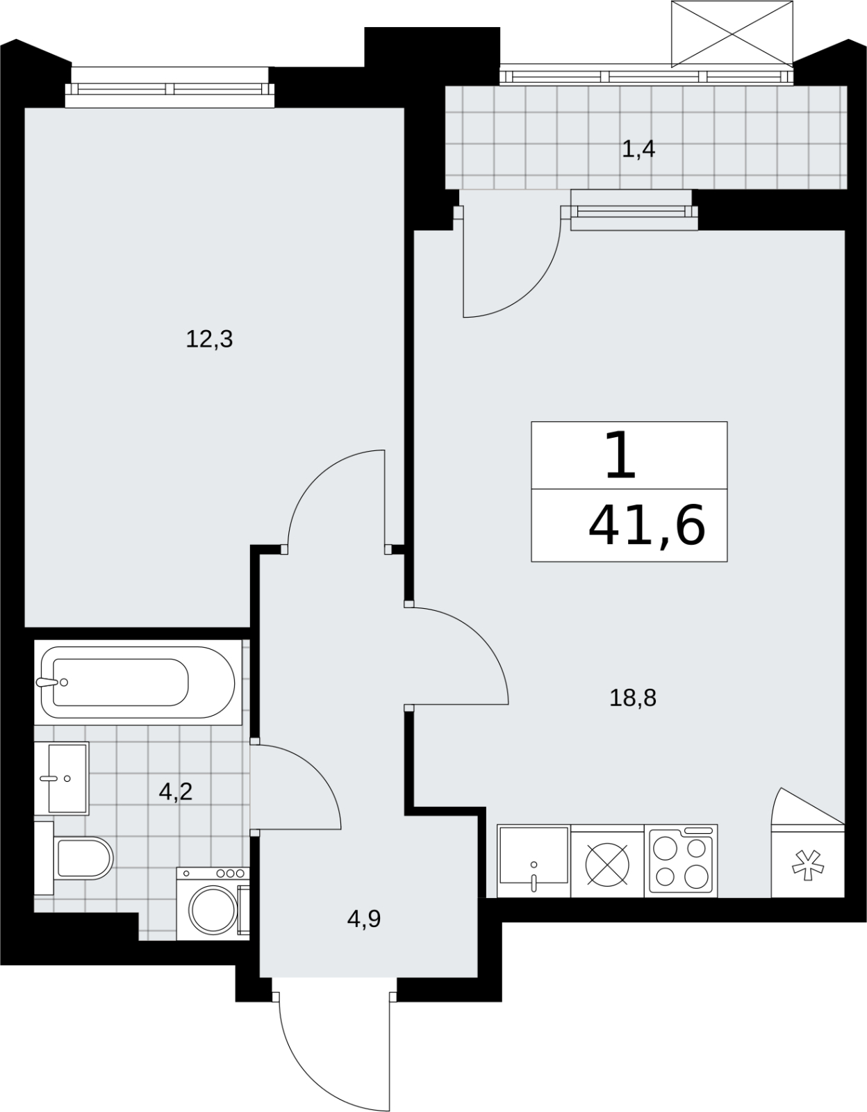 - Общая площадь 41.6 м²
