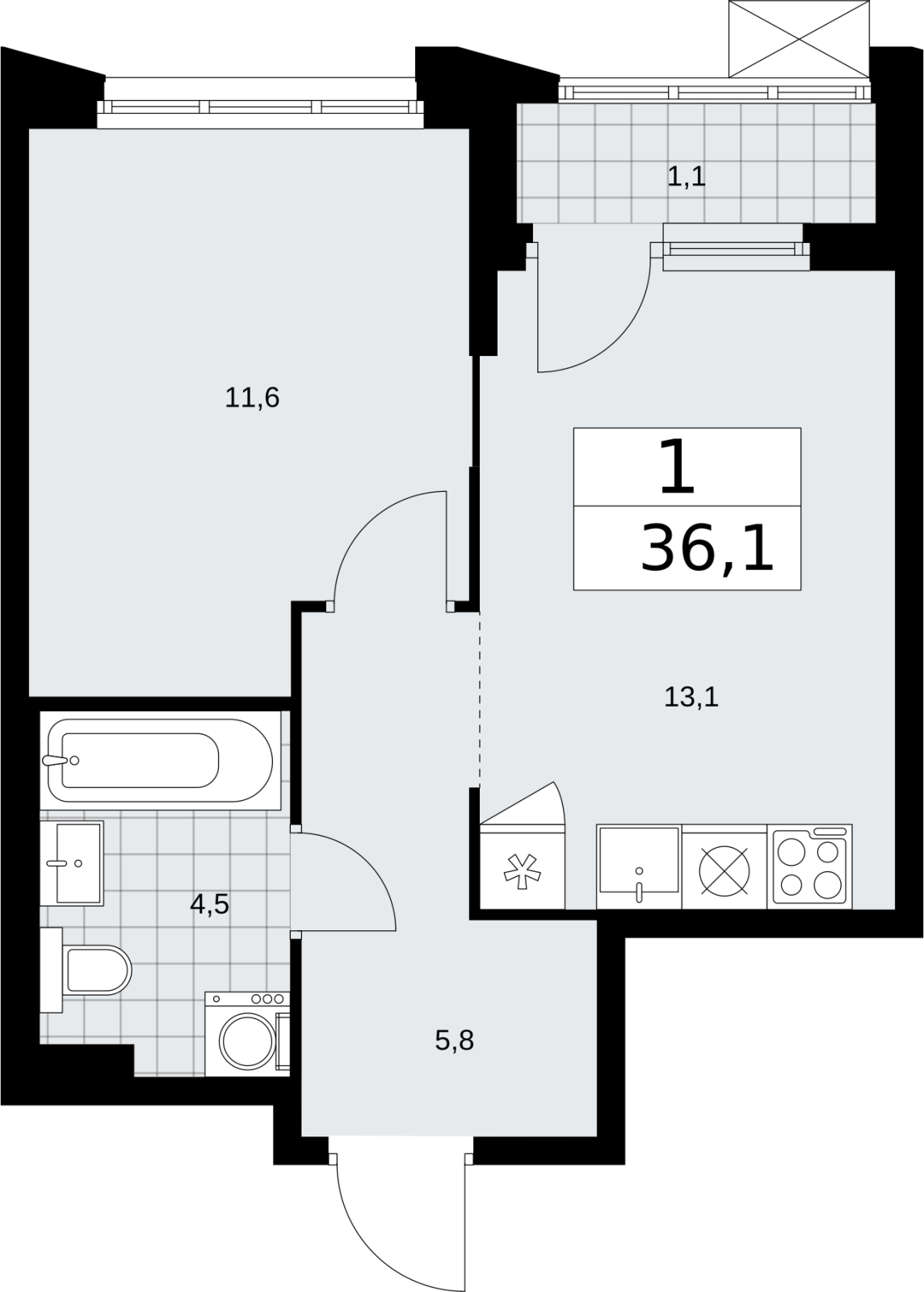 - Общая площадь 36.1 м²