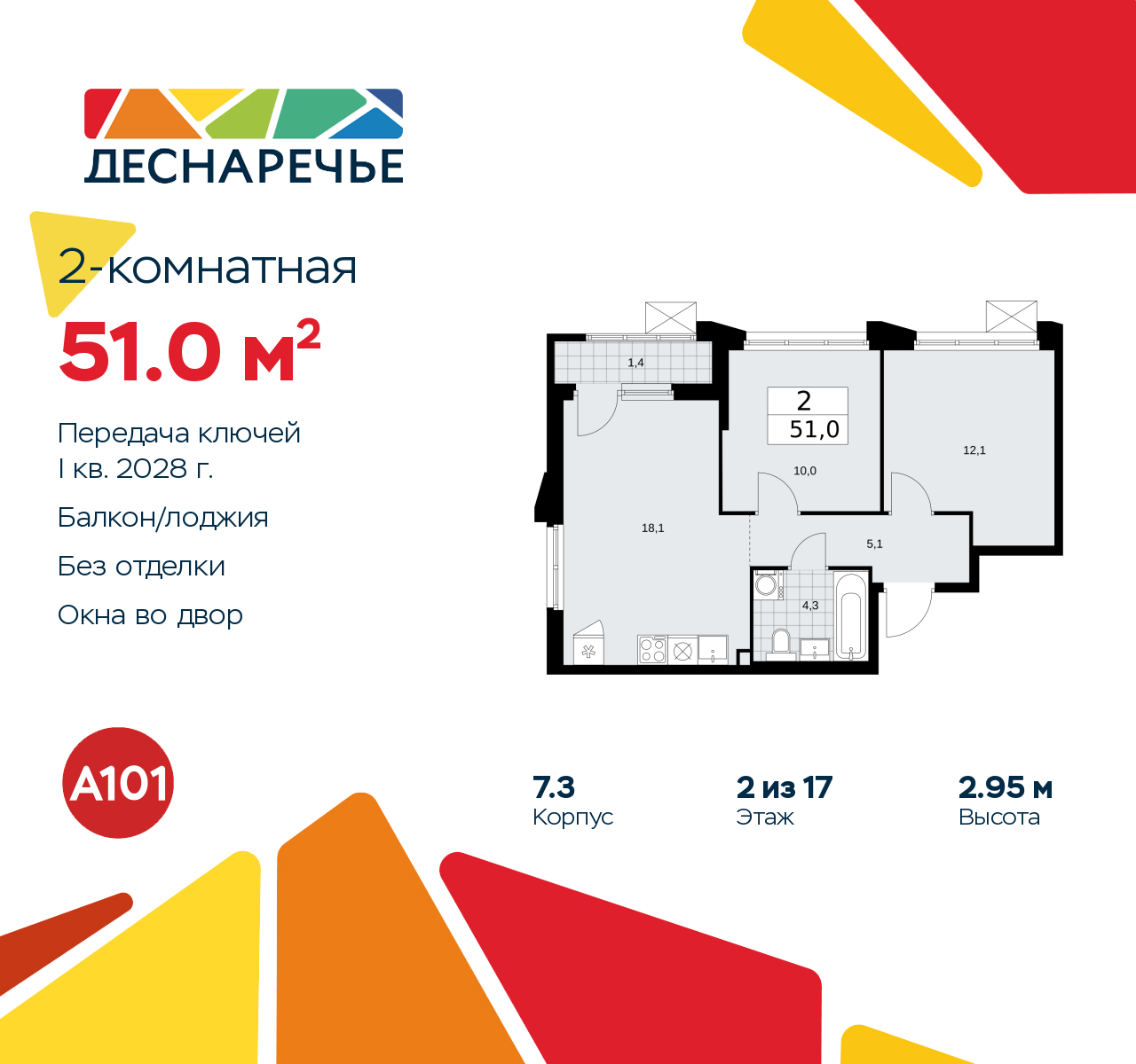 Продается 2-комн. квартира в ЖК "Деснаречье" на 2 этаже. Квартира без отделки, полностью готова к ремонту. Общая площадь: 51 кв.м., жилая: 22.1 кв.м., площадь просторной кухни-столовой: 18.1 кв.м. Квартира угловая, идеально подойдет любителям тишины и панорамных видов. В квартире одна лоджия, один совмещенный санузел. Высота потолков 2.95 м. Эта квартира предлагается без отделки. Будут установлены стеклопакеты с повышенной тепло- и шумоизоляцией, в квартиру заведены все коммуникации. Вы сможете в полном объеме реализовать ваши идеи обустройства вашего комфортного дома. Для тех, кто ценит время и не хочет дополнительных трат на ремонт мы предлагаем квартиры с предчистовой и дизайнерской отделкой. Дом монолитный, черырехподъездный, переменной этажности, от 9 до 17 этажей. Квартира находится в 1-й секции высотой 15 этажей в корпусе 7.3. На этаже 5 квартир. В подъезде 1 пассажирский и 1 грузовой лифт. Начало строительства - 2 квартал 2025 года. Окончание строительства - 1 квартал 2028 года. Оформление сделки по договору долевого участия. Артикул квартиры по базе застройщика 88К-7.3-593. ПРЕДЛОЖЕНИЯ ОТ ЗАСТРОЙЩИКА В ОКТЯБРЕ 2025: Ипотека от 13,9 % для всех! На весь срок. "Семейная ипотека" вернулась. Ставка от 3,5 % на весь срок! Без удорожания! Выгодное ипотечное комбо: Ипотека от 2200 р./мес. и от 6 % после рождения ребёнка! Ипотека для всех "Держи пять!" - ставка 5 % на 2 года! *более подробную информацию по скидкам и акциям уточняйте в отделе продаж Масштабный проект "Деснаречье" на юго-западе Москвы, который включает три новых района («квартала»), объединённые общей идеей – воплотить в реальность мечты современных жителей столицы об интересном, комфортном и разноплановом городском пространстве в окружении рек и лесов, словно сошедших с полотен русских живописцев: - «Берег» оценят все, кому близка водная стихия: плеск волн, солнечные блики и прогулки вдоль тихого течения речи. - «Лес» утопает в зелени парков и лесов. Здесь соблюдён идеальный баланс загородного спокойствия и столичного комфорта. - «Парк», самый энергичный и яркий, отличается высокой концентрацией пространств для спорта и творчества. Жилой комплекс "Деснаречье" расположится в 12 км от МКАД по современному Калужскому шоссе. Внешний облик зданий соответствует современному стилю и стандартам, характерным и для других популярных проектов ГК «А101»: сочетание контрастных тонов, большое количество остекления, в котором отражается небо, гармония с природным окружением. Весь город - в вашем районе. Находиться на территории «15-минутного города» значит иметь всё необходимое для полноценной жизни в шаговой доступности. Маршруты в районе «Деснаречье» выстроены так, чтобы добраться до магазинов, парков, школ, салонов услуг и других объектов можно было всего за несколько минут пешком или на велосипеде. Двор закрытый от машин – это тишина, комфорт и безопасность, поэтому все машино-места (включая «семейные» и увеличенные, с возможностью установки роллетных шкафов) находятся в подземном паркинге. В паркинги можно спуститься на лифте из любого подъезда или по лестнице. Рядом с «Деснаречьем» в 2027 году планируется открытие станции метро «Десна», до которой будет удобно добраться пешком или на велосипеде. Дорога на автомобиле до перехватывающих парковок станций «Ольховая» и «Прокшино» займёт около 10 минут. В процессе реализации