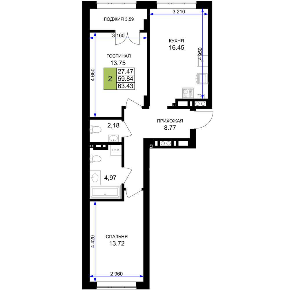 - Общая площадь 63.43 м²